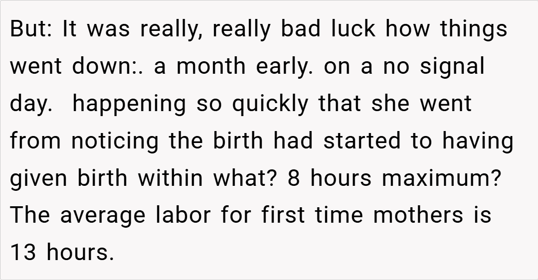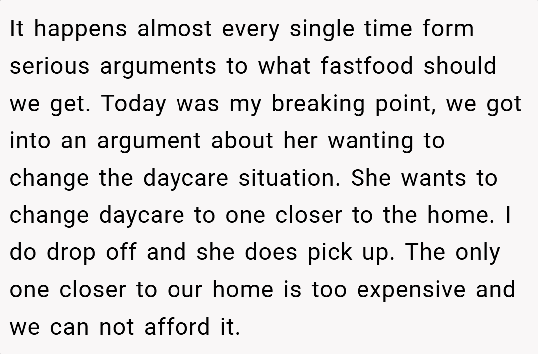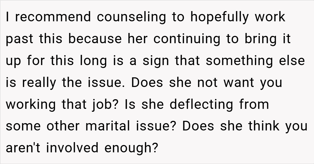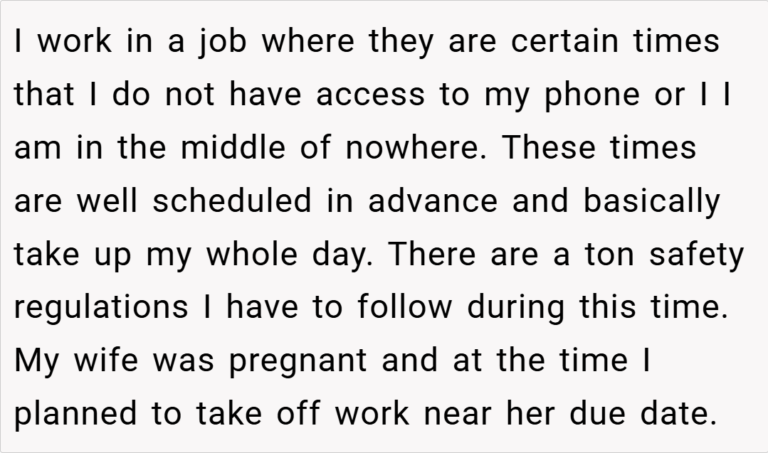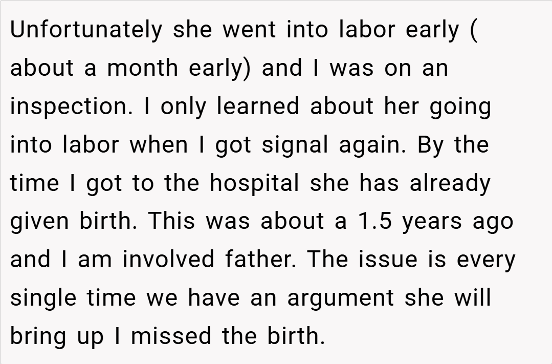 Due to his job’s strict schedule and safety regulations, he was on an inspection when she went into labor about a month early—so by the time he got a signal and reached the hospital, the baby had already been born. Although he has been an involved father since then, his wife repeatedly brings up that he missed the birth during arguments, whether they’re about serious matters or even trivial decisions like choosing fast food.