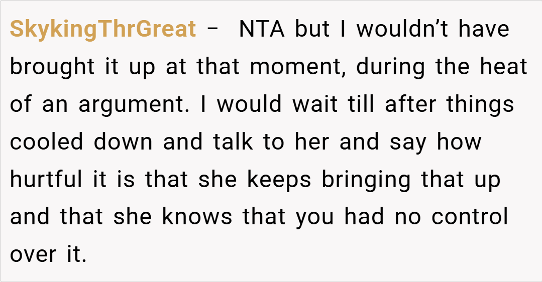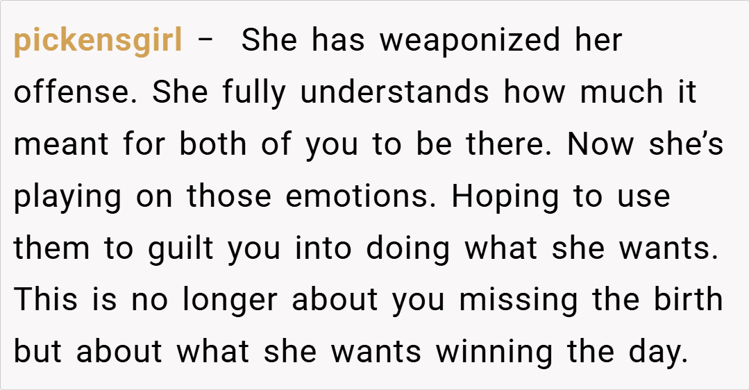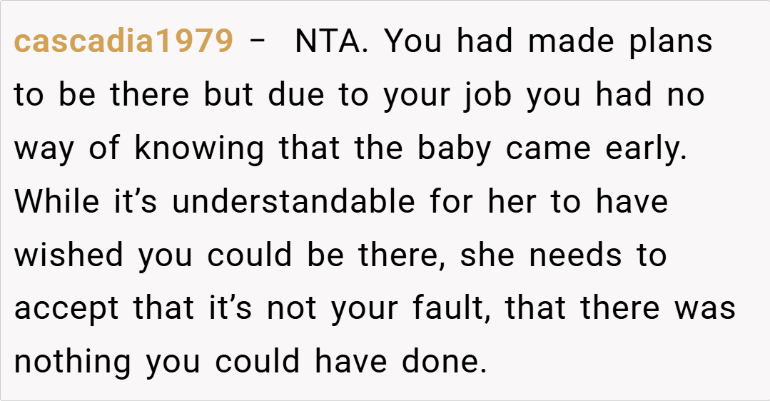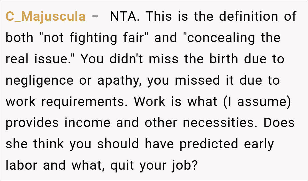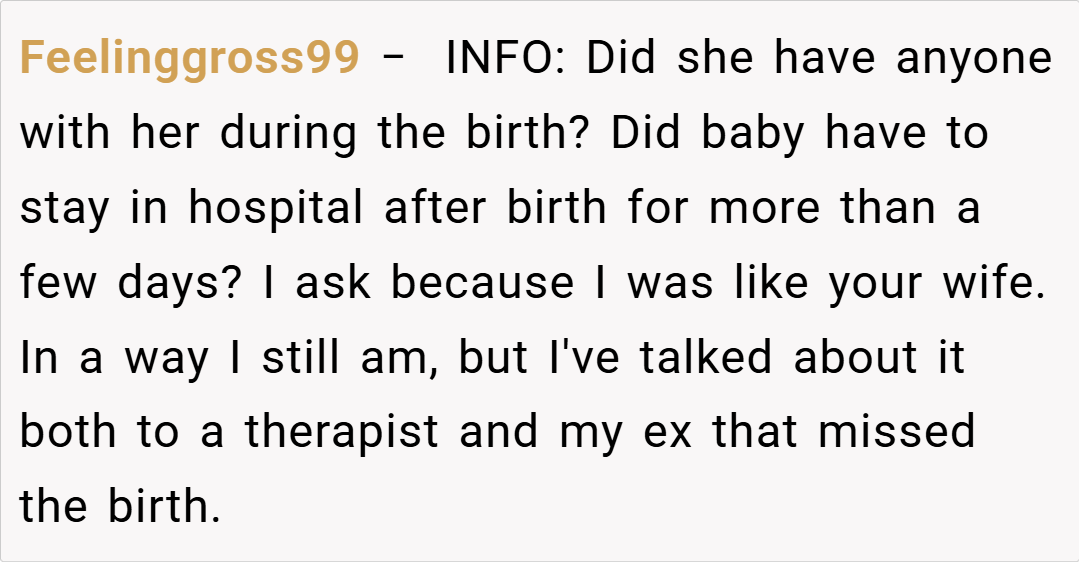 Several redditors expressed support for his stance. One user commented, “If you missed the birth due to circumstances beyond your control, it’s unfair to have it thrown in your face every time. You’re not the asshole for wanting to move forward.”