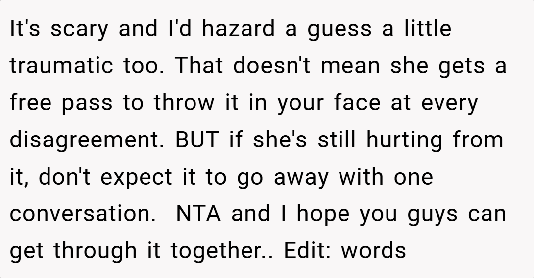 Frustrated beyond measure during a recent disagreement about daycare arrangements, he snapped, telling her to “get over it” and stop using that past event as a weapon in every argument. Now, he wonders if his blunt approach makes him the asshole for expecting her to move on. Is it fair to insist that a painful memory no longer be a recurring topic, even when it continues to affect the dynamics of their relationship?