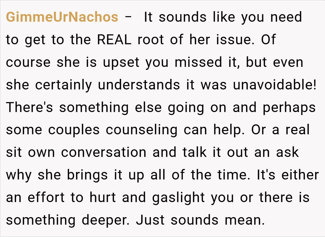 Dr. Laura Markham, a clinical psychologist specializing in relationship dynamics, explains, “When a significant life event—like the birth of a child—is missed due to unavoidable professional obligations, the resulting hurt can be compounded if it’s repeatedly used as ammunition in later conflicts. It is natural for one partner to hold onto that pain, but constantly bringing it up can prevent healing. Setting boundaries about rehashing past events is an important step in moving forward.”