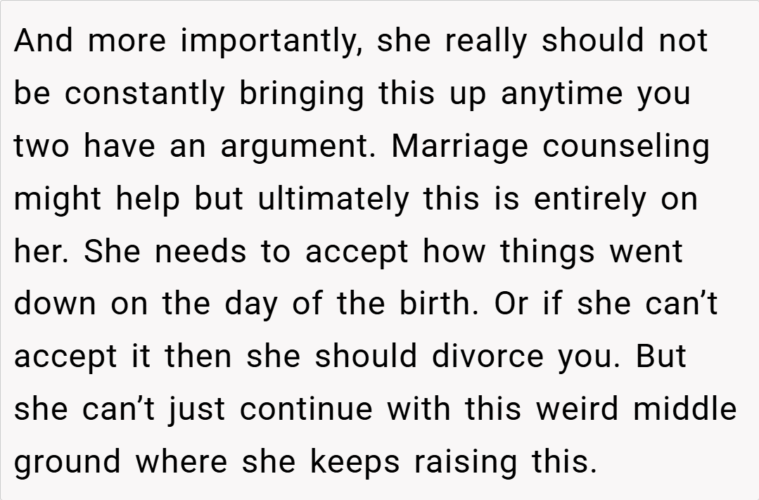 A healthy resolution might involve structured communication—perhaps with the help of a couples therapist—to help both partners navigate their emotions and find common ground.” Both experts agree that while his desire to stop the recurring mention of the missed birth is valid, it is crucial to address the underlying emotional wounds through open dialogue and possibly counseling, rather than dismissing the issue outright.