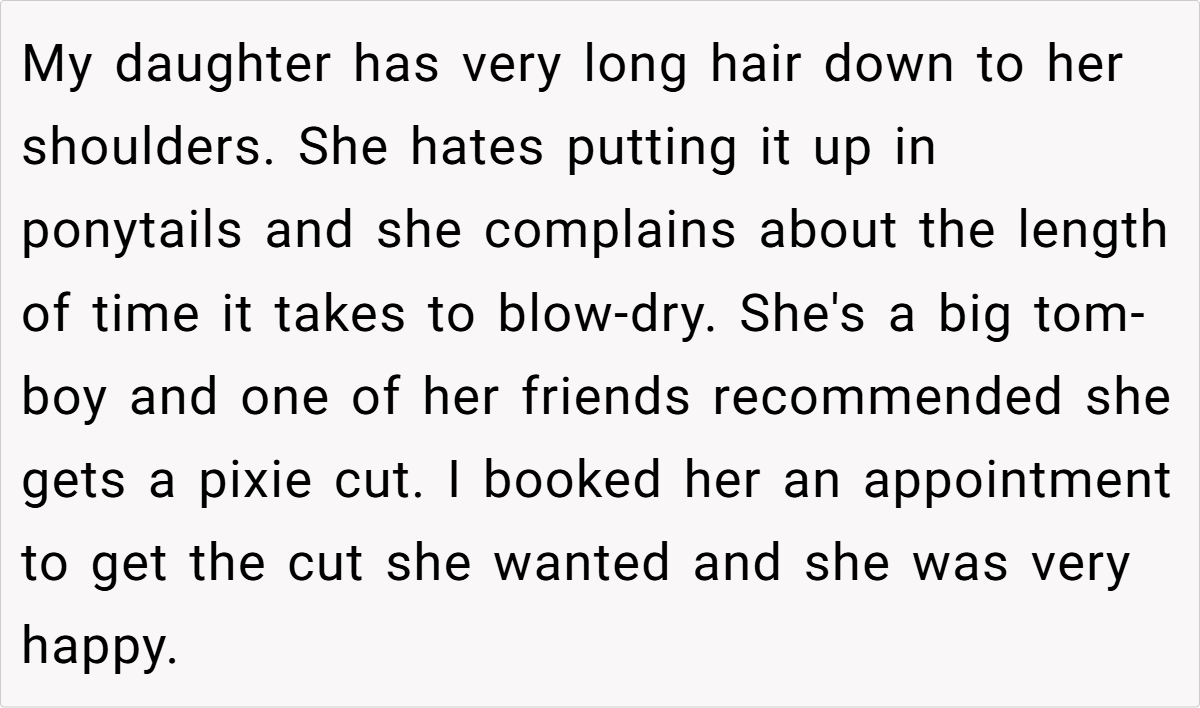 Tired of the hassle and eager for a fresh look, she opted for a pixie cut, a decision that made her genuinely happy. However, when the father proudly presented her new style to his wife, who has long admired her stepdaughter’s flowing locks, the reaction was far from what he expected.