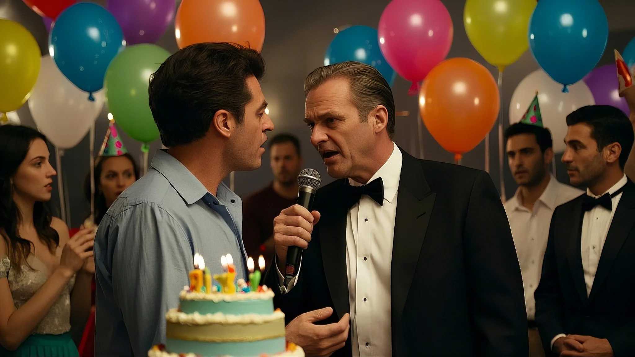 A tense moment at a lively birthday party, with a man holding a microphone and angrily addressing another guest. The guest, visibly furious, is being restrained by other attendees.