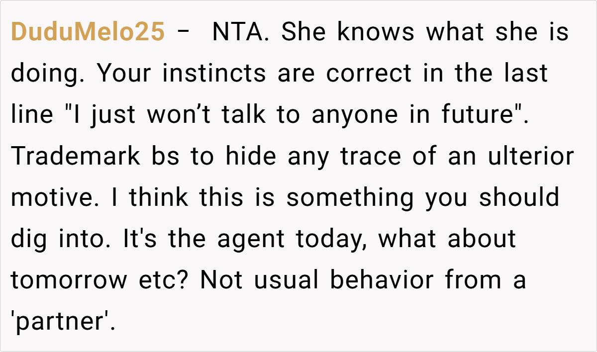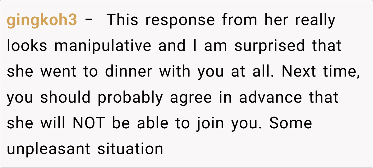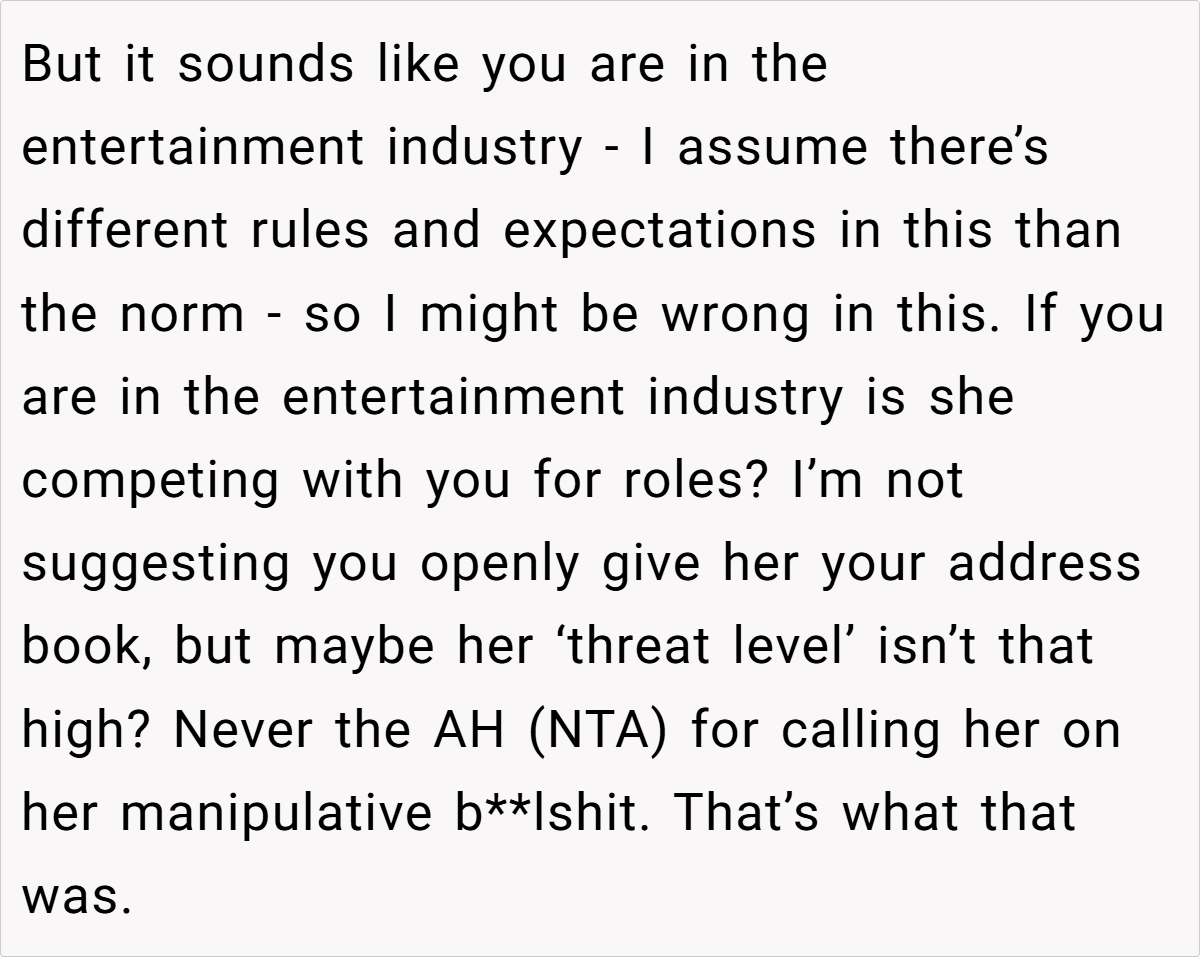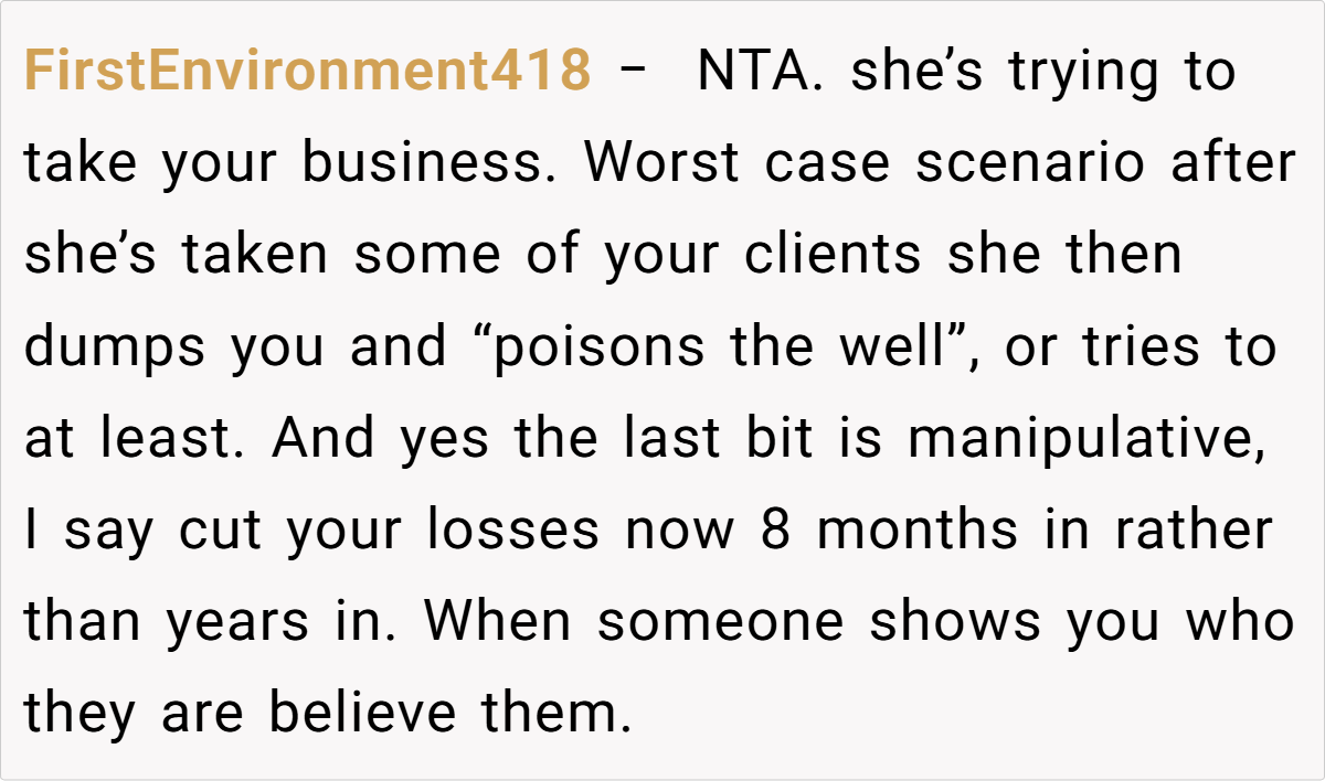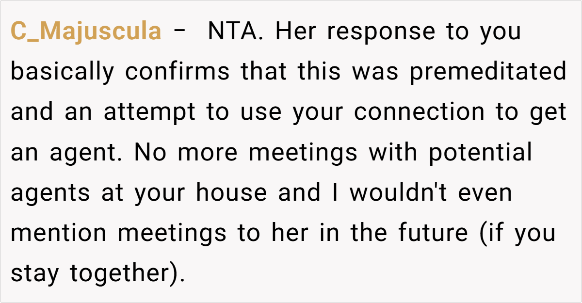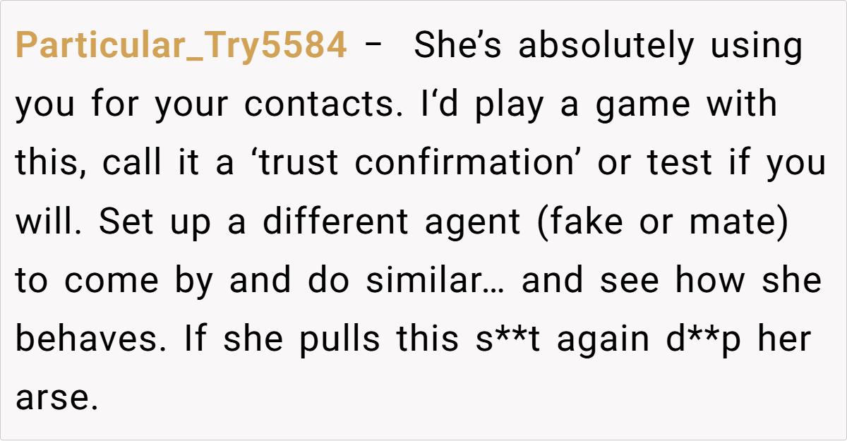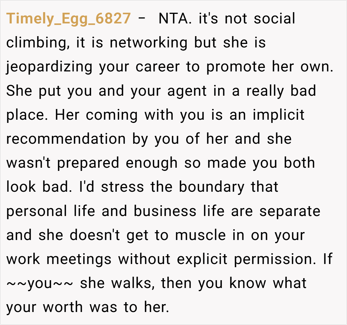 The Reddit community overwhelmingly agrees with OP’s concerns. Most commenters label the girlfriend’s behavior as opportunistic and manipulative, pointing out that her actions were clearly intended to climb the social ladder at the expense of OP’s professional interests. Many users recommend that OP set firm boundaries to protect his career, with some even suggesting a “test” of her motives to see if this behavior recurs.