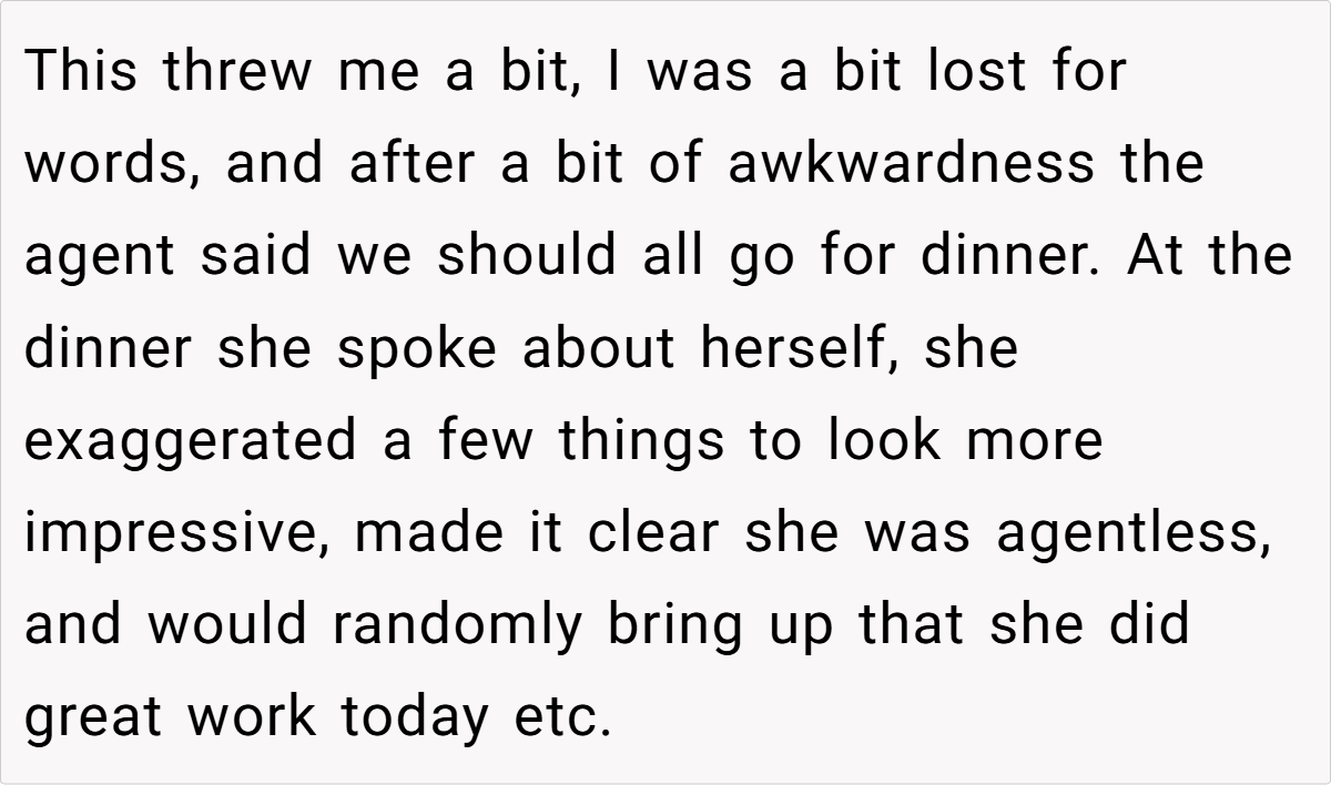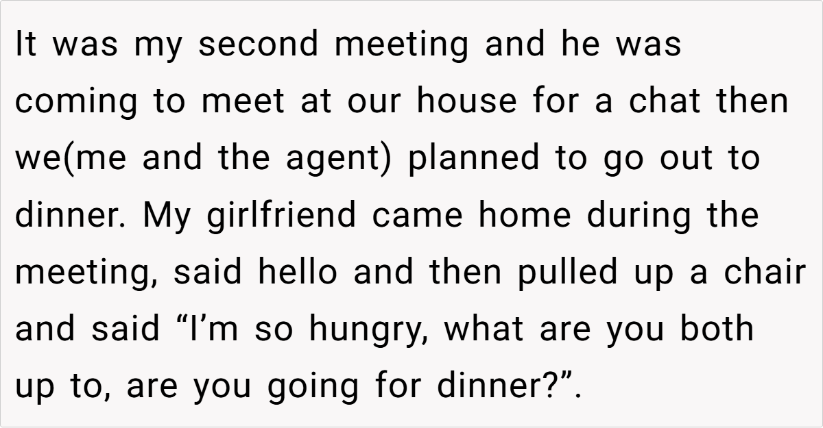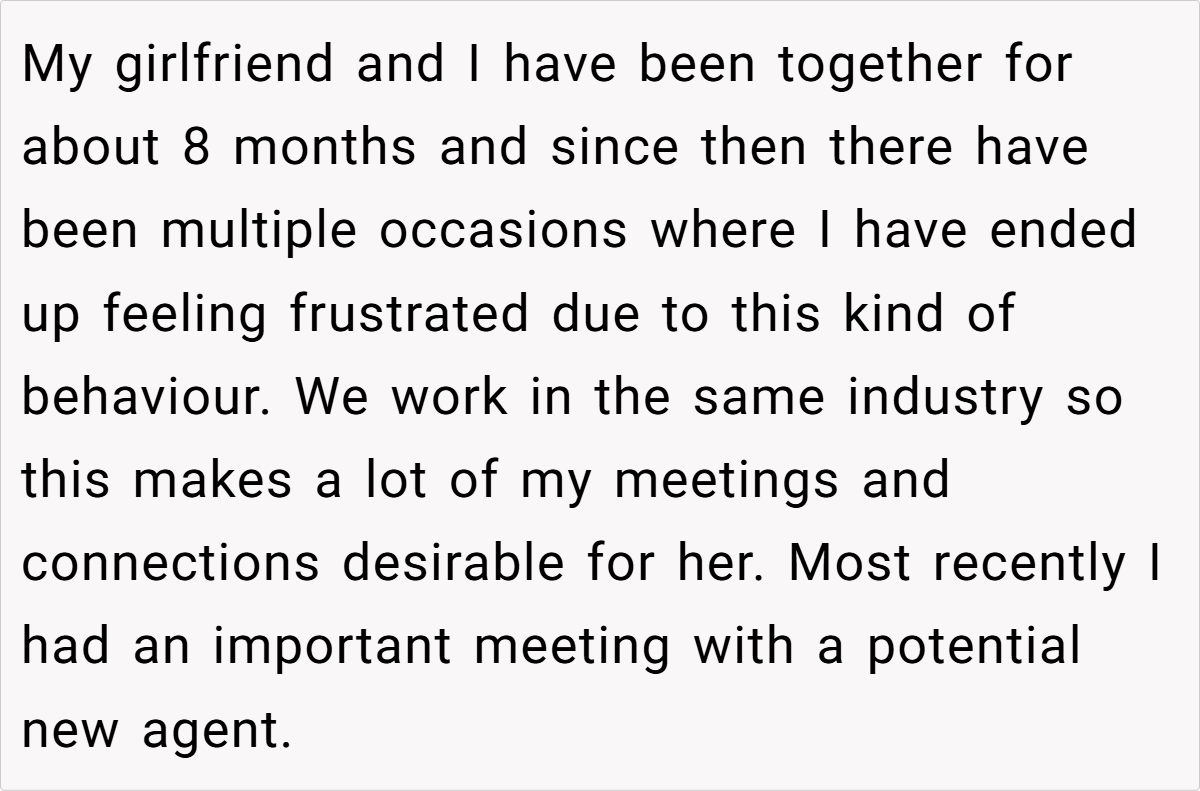 Navigating a relationship in an industry where professional networks are everything can be a minefield. For eight months, OP’s girlfriend has woven herself into the fabric of his work life, but not always in ways that feel supportive. During an important meeting with a potential agent—one that was meant to open doors for OP—the girlfriend’s unexpected appearance and subsequent behavior raised red flags.