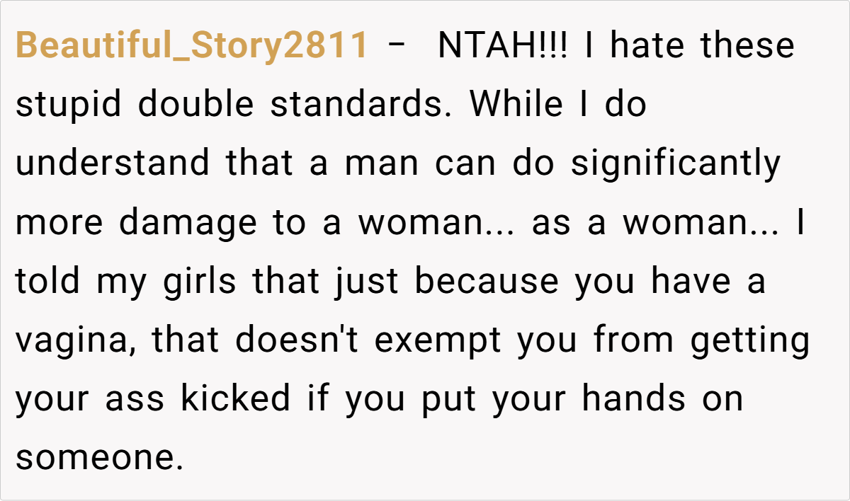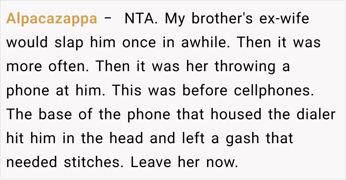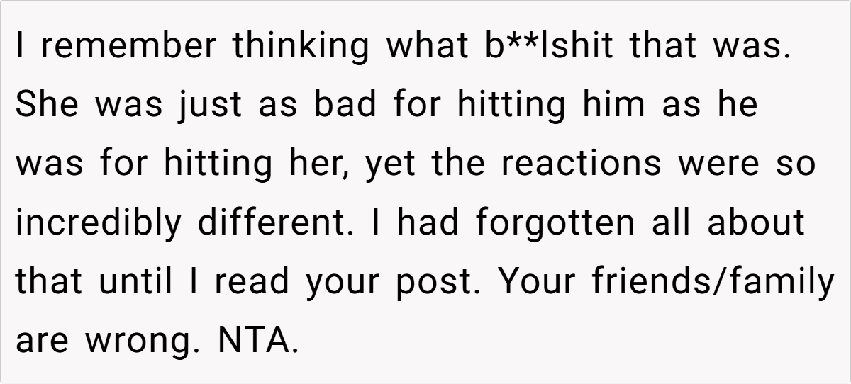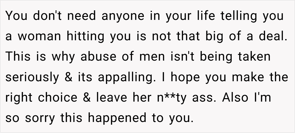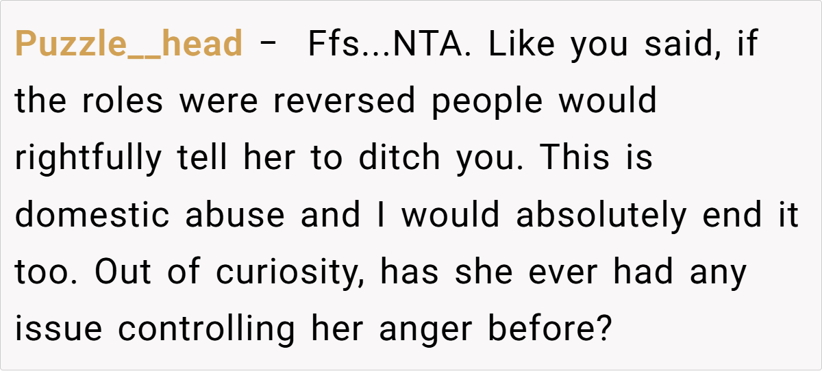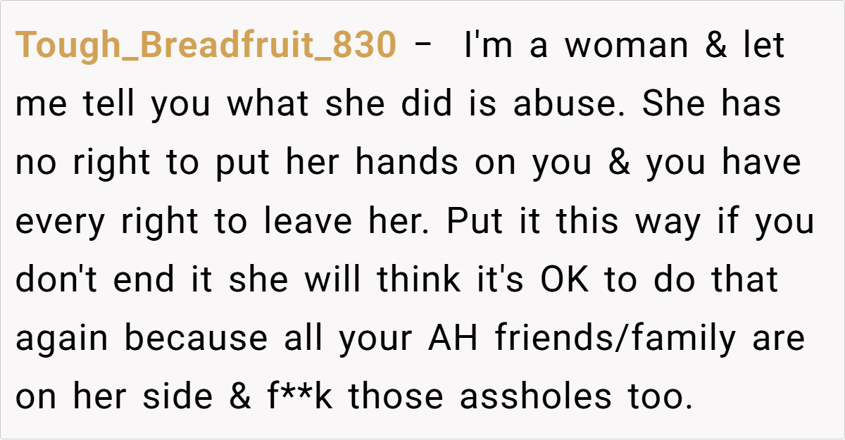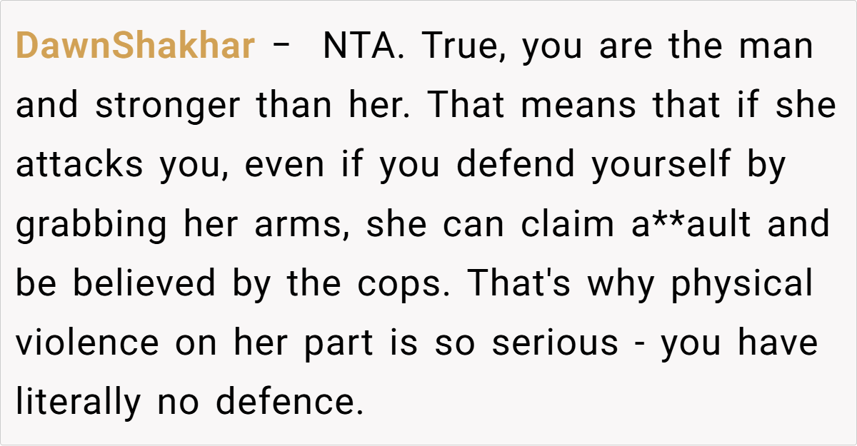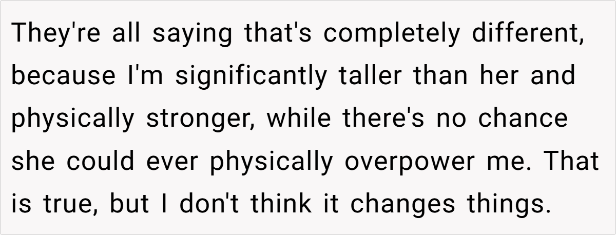 The broader redditor community expresses a general consensus that any instance of physical violence—no matter how brief or seemingly isolated—is a red flag in a relationship. Many say that while some might argue your reaction is an overreaction due to physical size differences, emotional harm isn’t measured solely by physical force.