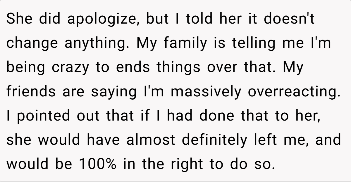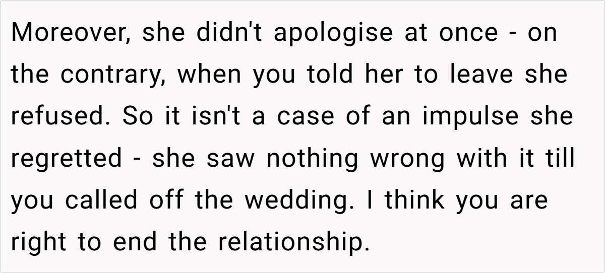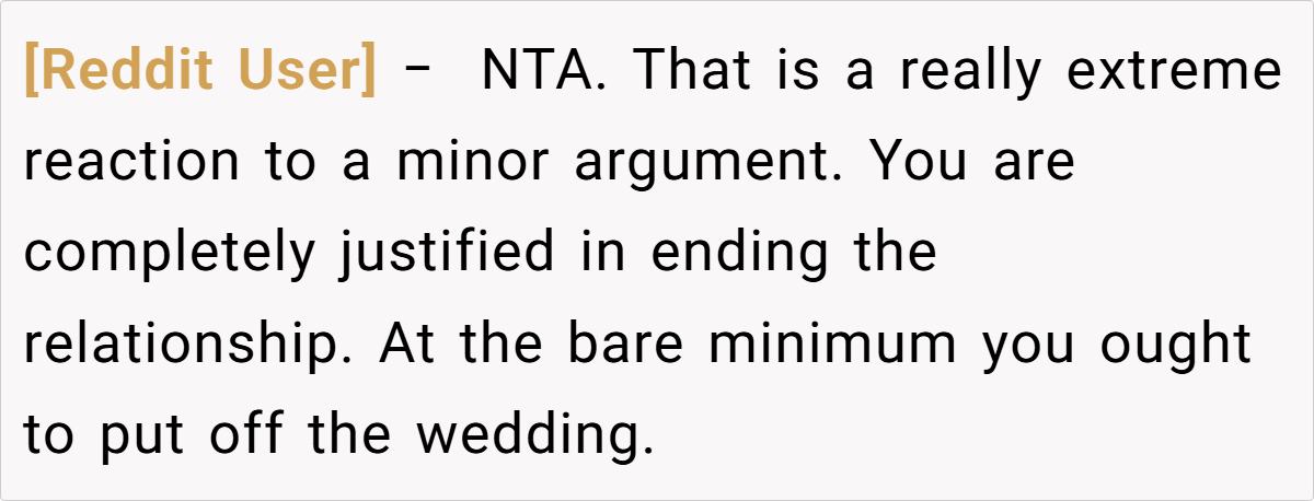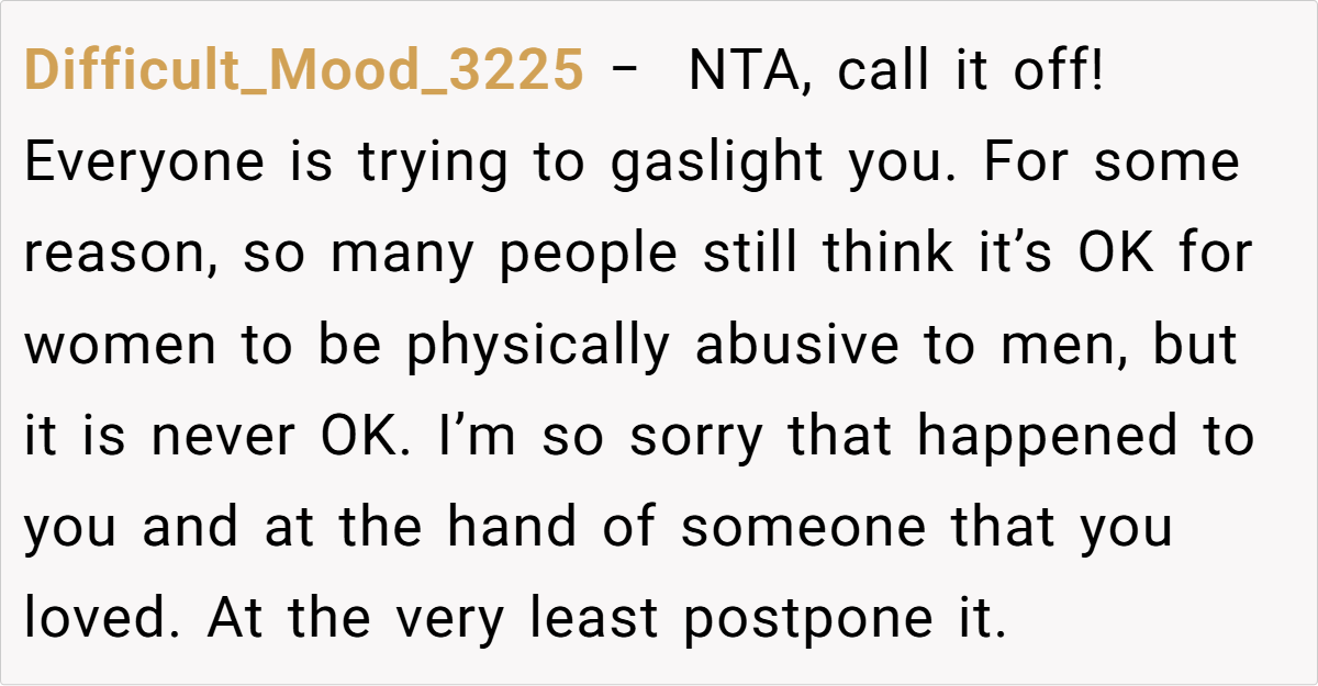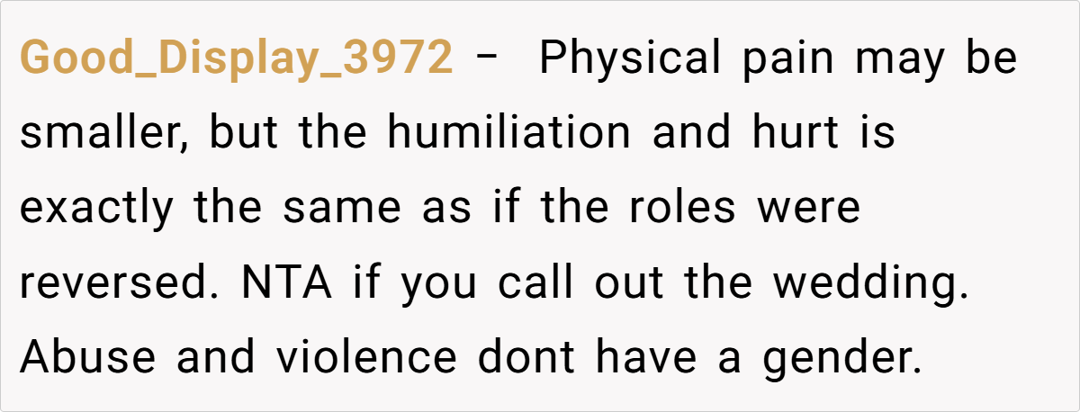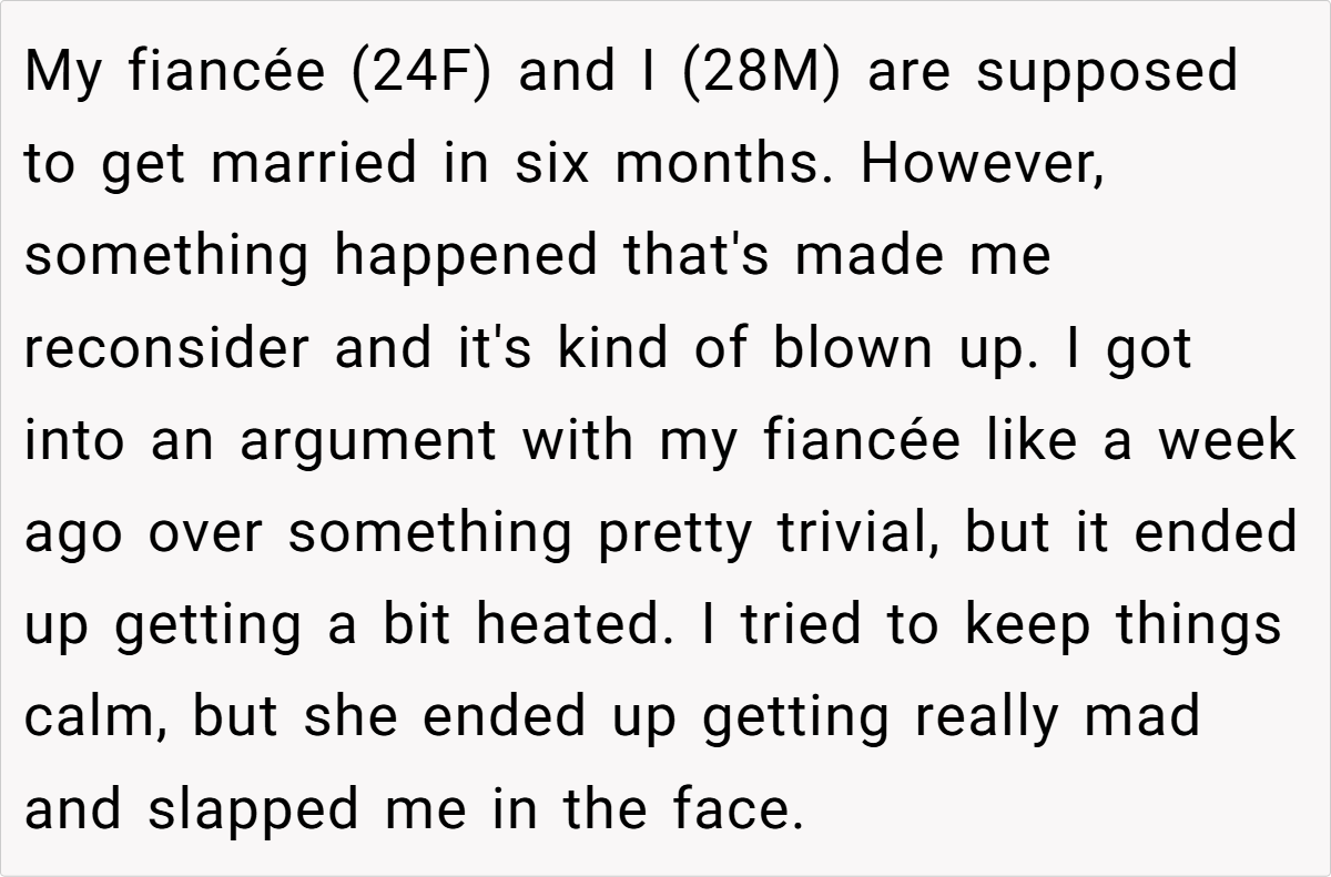 Although the incident occurred over a relatively trivial disagreement, it has forced him to reconsider the future of their relationship and even the upcoming wedding. With mounting pushback from friends and family—who argue that his reaction is overblown due to physical differences—he now wonders if he’s being unreasonable for considering ending the engagement.