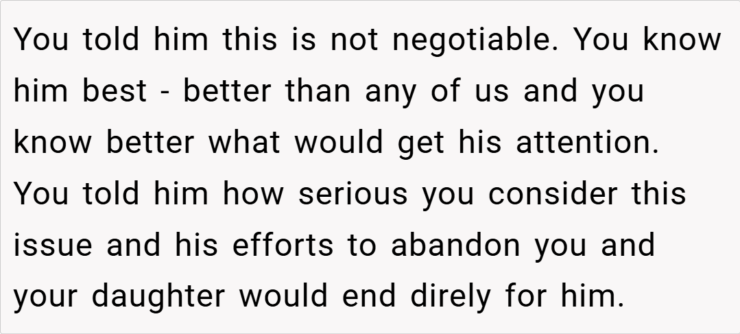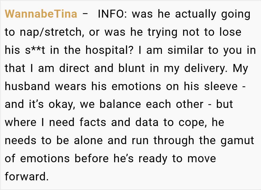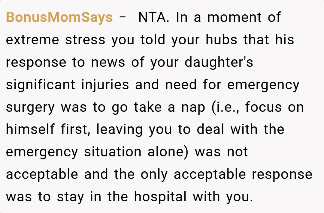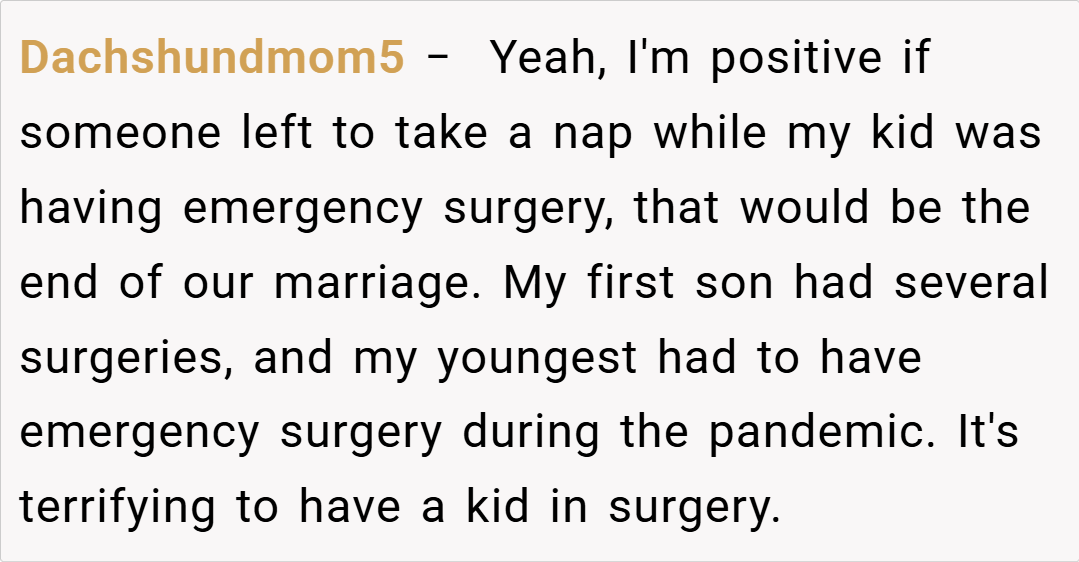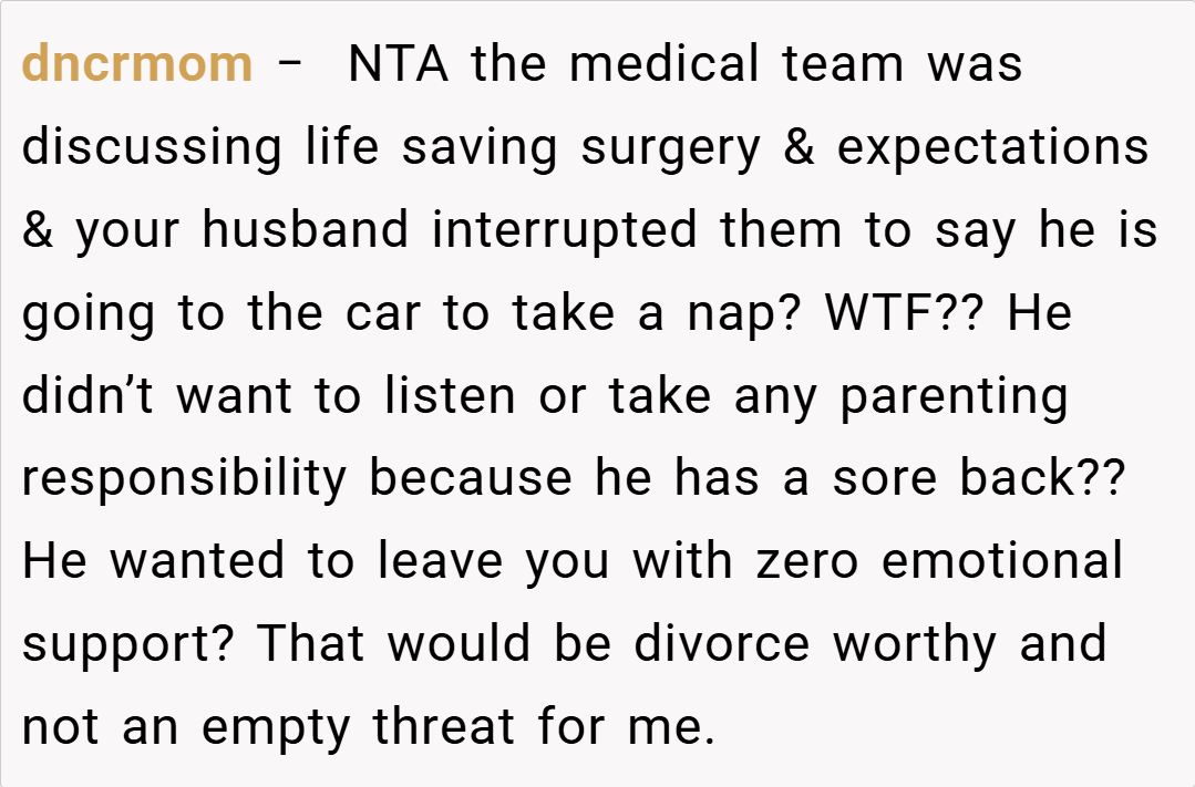 Ultimately, the OP’s decision to threaten divorce stems from a deep need for support during a family crisis. While her boyfriend’s need to rest might be understandable in isolation, in the context of a medical emergency involving her daughter, his absence felt like a betrayal.