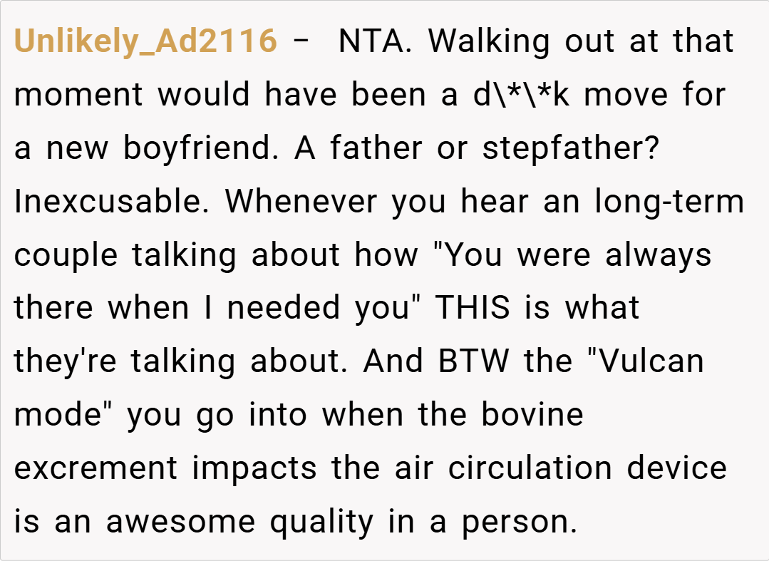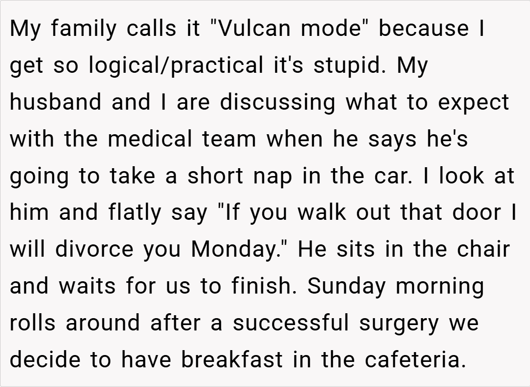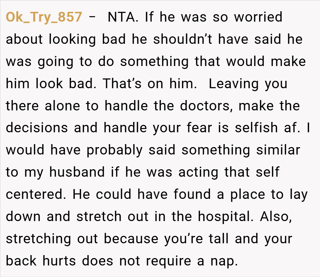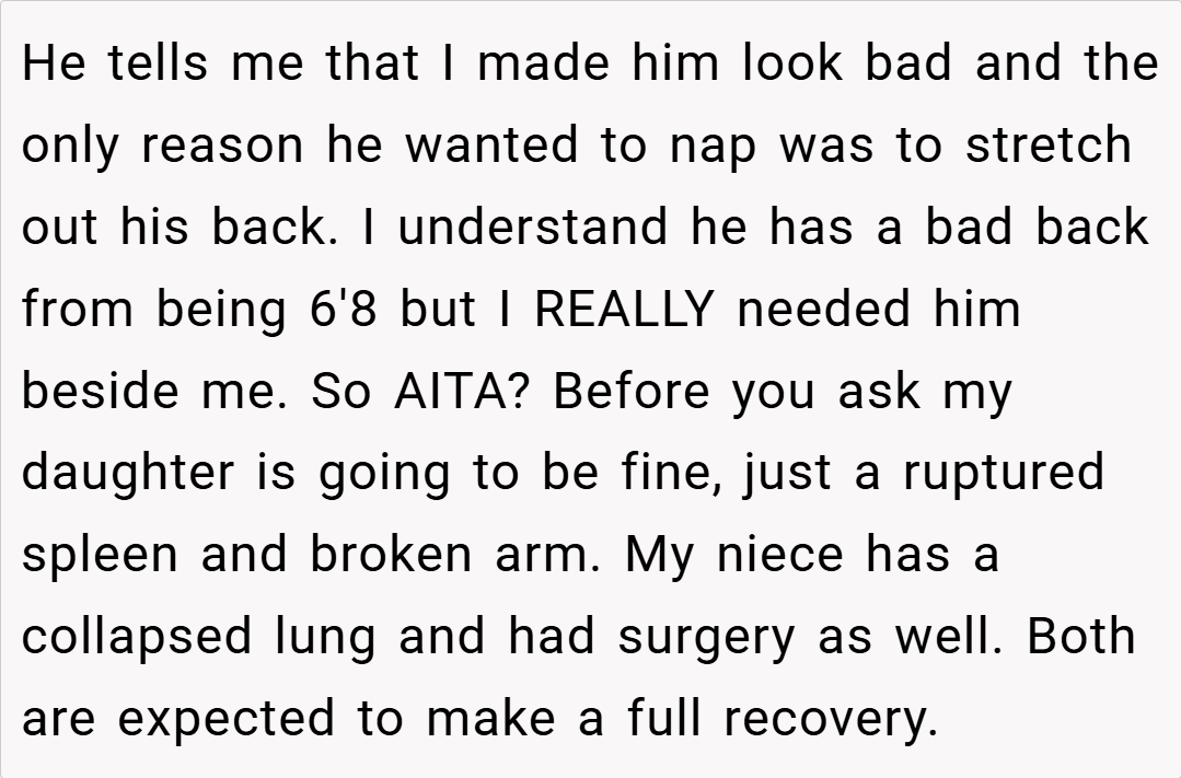 Ultimately, the OP’s decision to threaten divorce stems from a deep need for support during a family crisis. While her boyfriend’s need to rest might be understandable in isolation, in the context of a medical emergency involving her daughter, his absence felt like a betrayal.