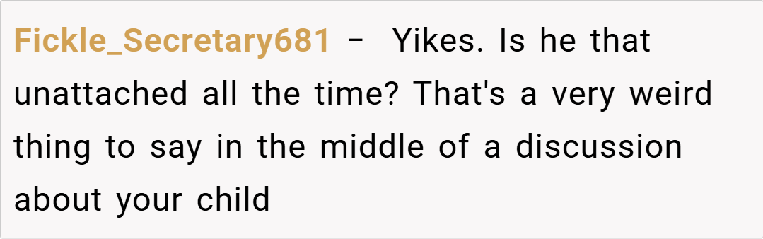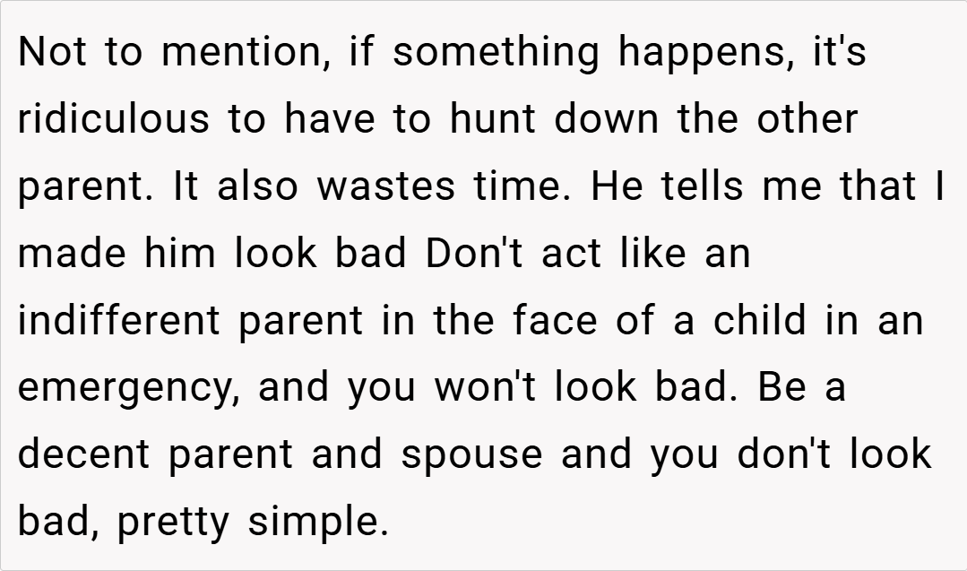in an emergency it can be perceived as neglect, especially if the other partner feels isolated during a vulnerable moment. Family therapist Dr. Susan Johnson adds, “In relationships, particularly during high-stress events like a medical emergency involving a child, clear and supportive communication is key. If one partner is unable or unwilling to provide that support—even if the excuse is a physical ailment—it’s understandable for the other partner to set a strict boundary.