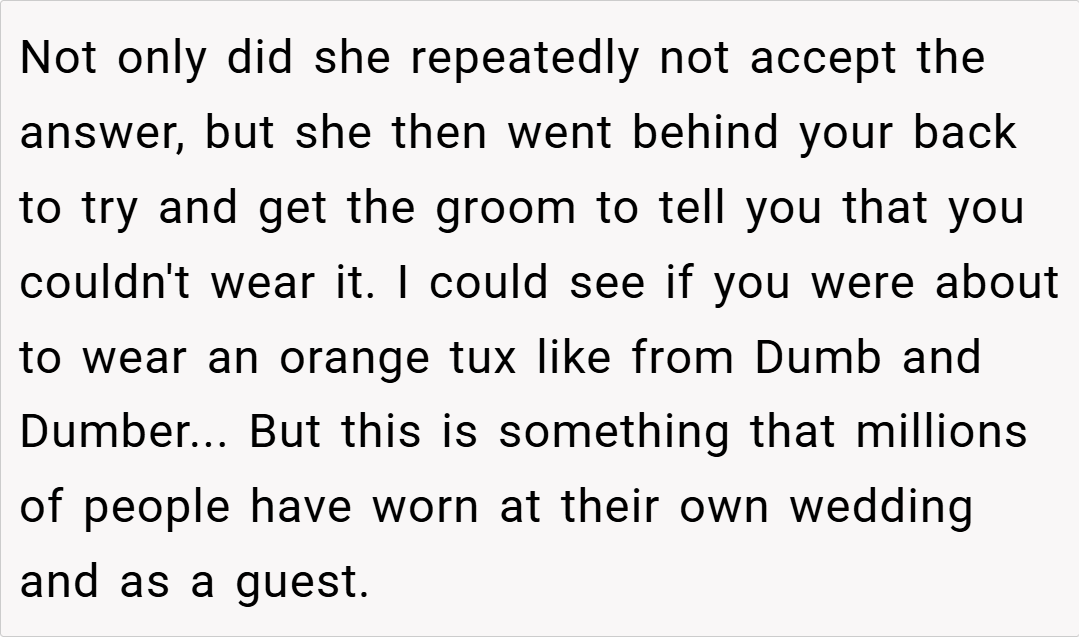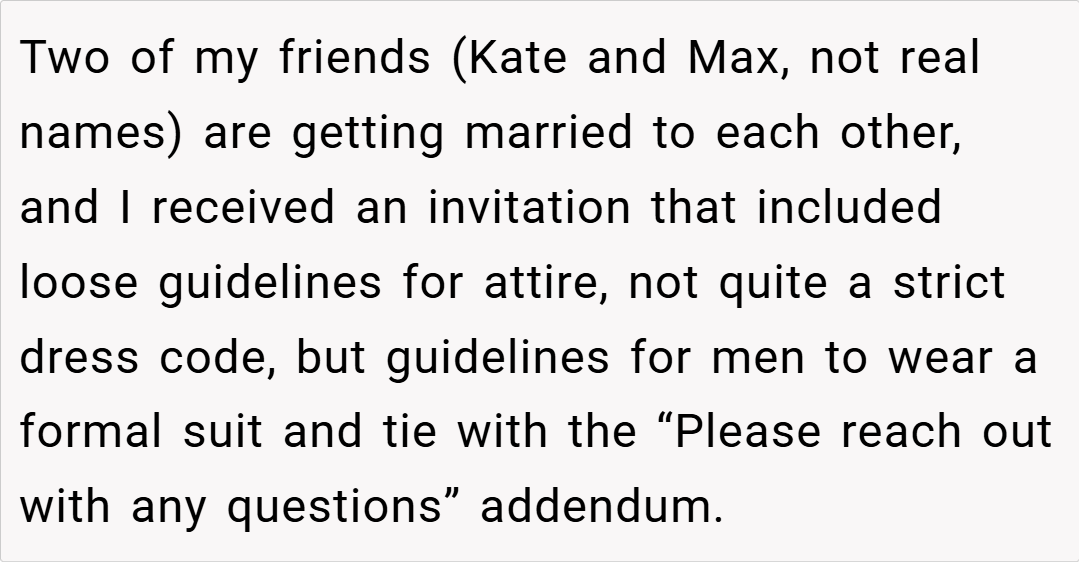 However, his girlfriend, Sara, who comes from a more conservative background, strongly objected, even going behind his back to influence the groom. In the heat of an argument, he threatened not to take her as his plus-one if she couldn’t accept his choice. Now, as emotions settle, he’s left wondering if his firm stance on self-expression was too dramatic—or completely justified.