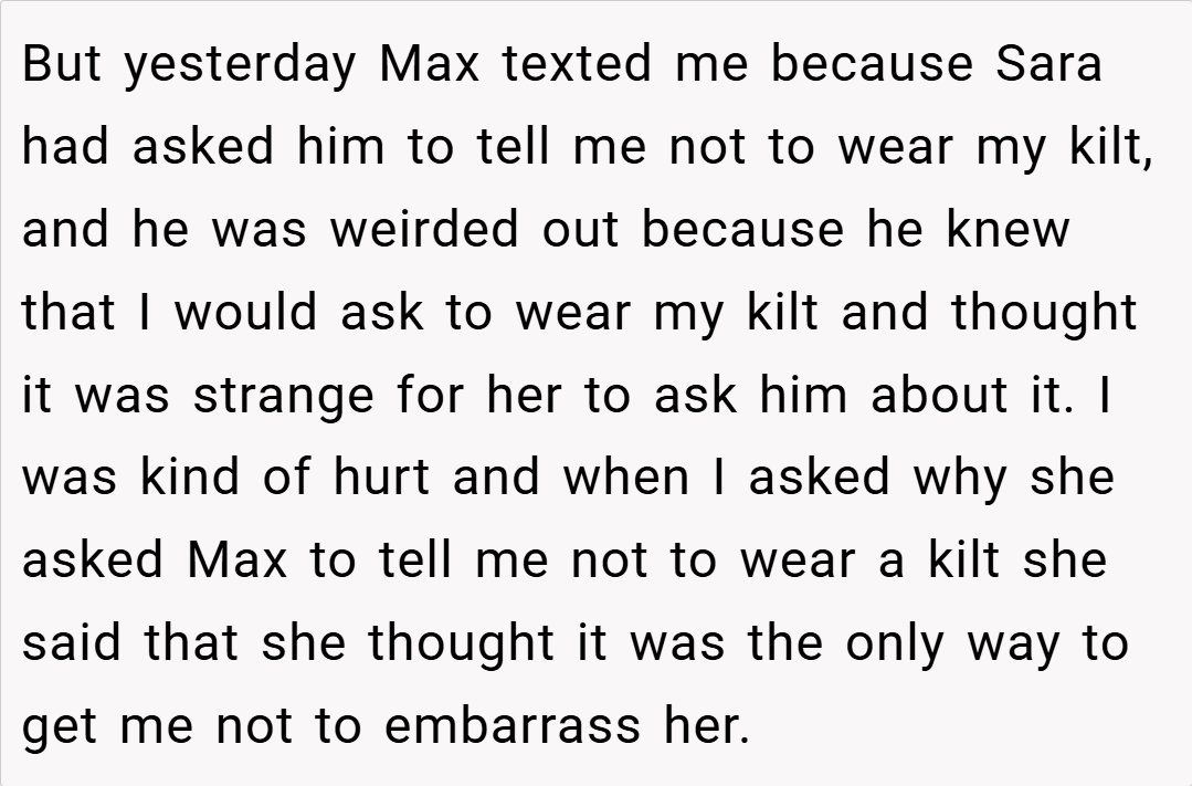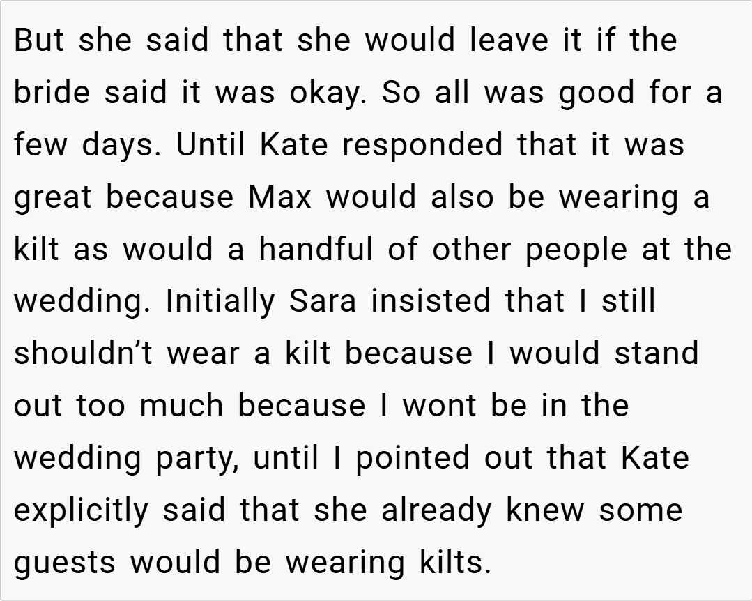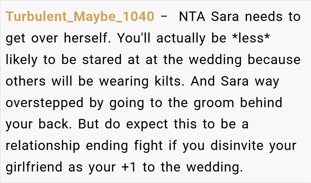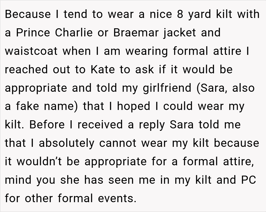 In this case, the fact that Sara went behind his back by asking someone else to relay her concerns to the groom indicates a breakdown in communication that could have been avoided with an honest discussion about their differing perspectives. Ultimately, his decision to insist on wearing his kilt—even at the risk of offending his girlfriend—reflects a commitment to his identity, something experts believe is vital for long-term personal happiness and authenticity.