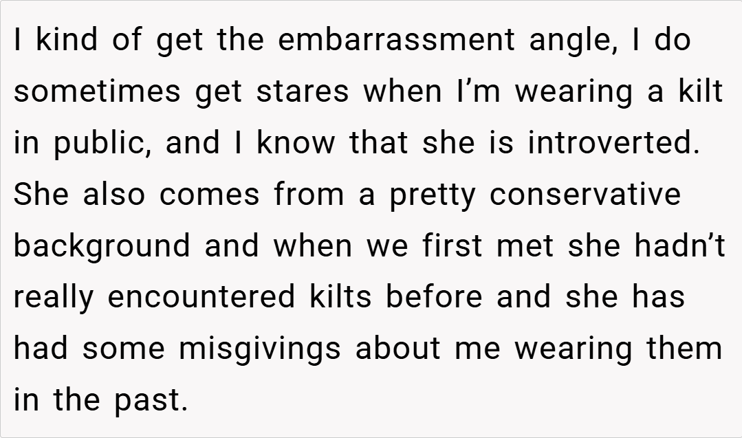 Overall, the community sees her attempts to control your wardrobe—especially by involving others behind your back—as overstepping and unfair. Your self-expression in the form of a kilt is celebrated, and most believe that any discomfort should be addressed through open communication rather than restricting your individuality.