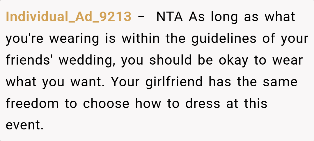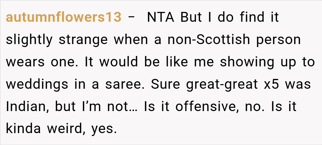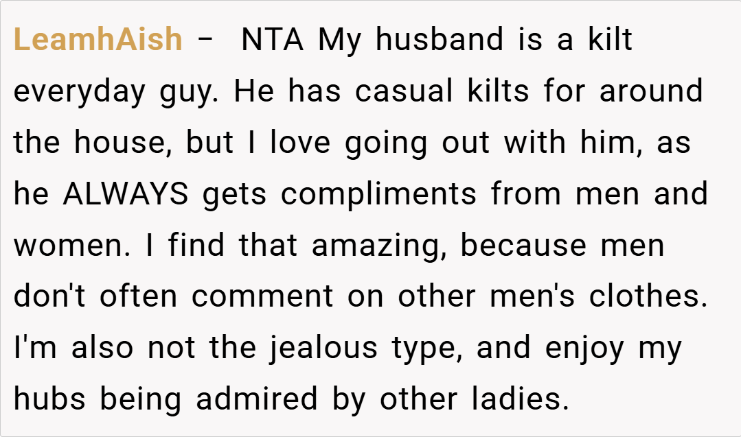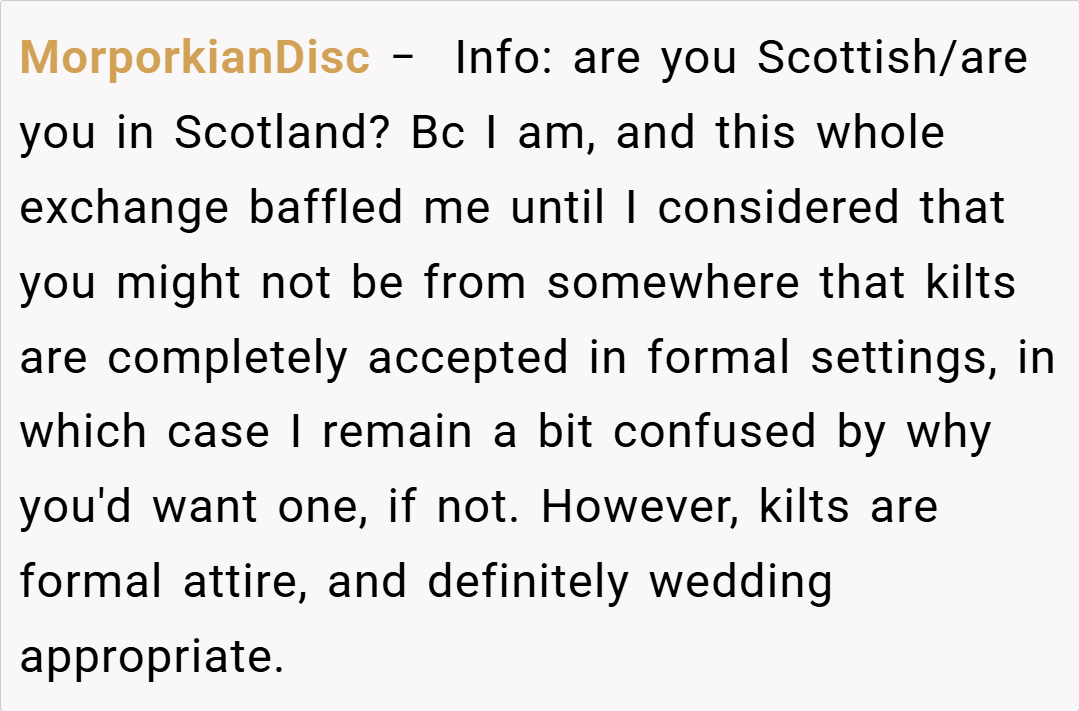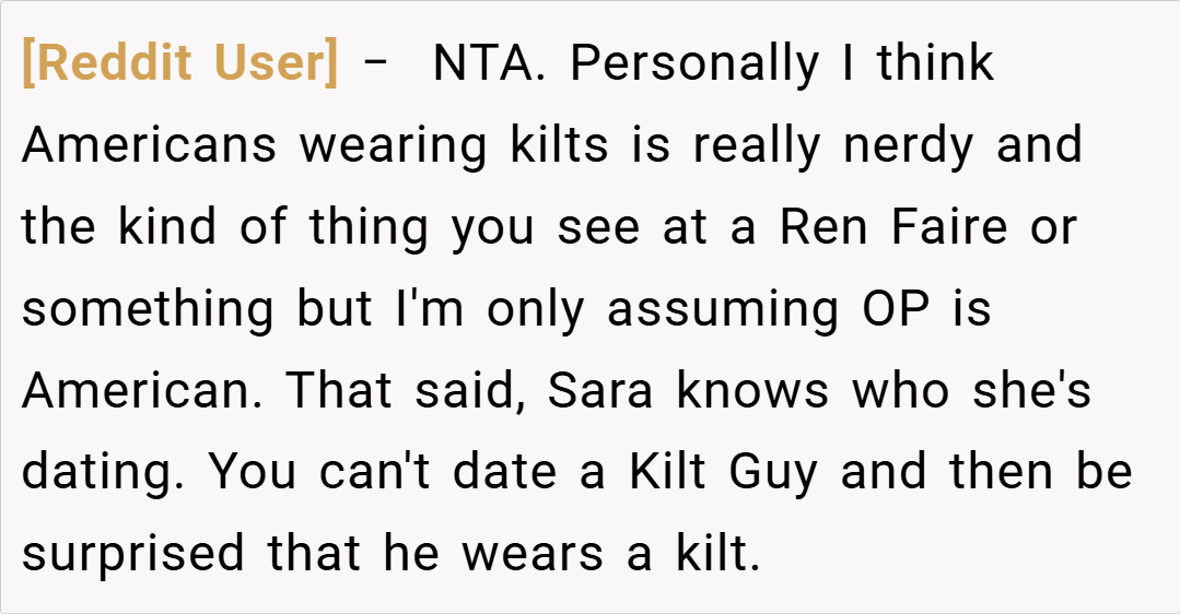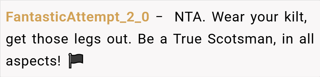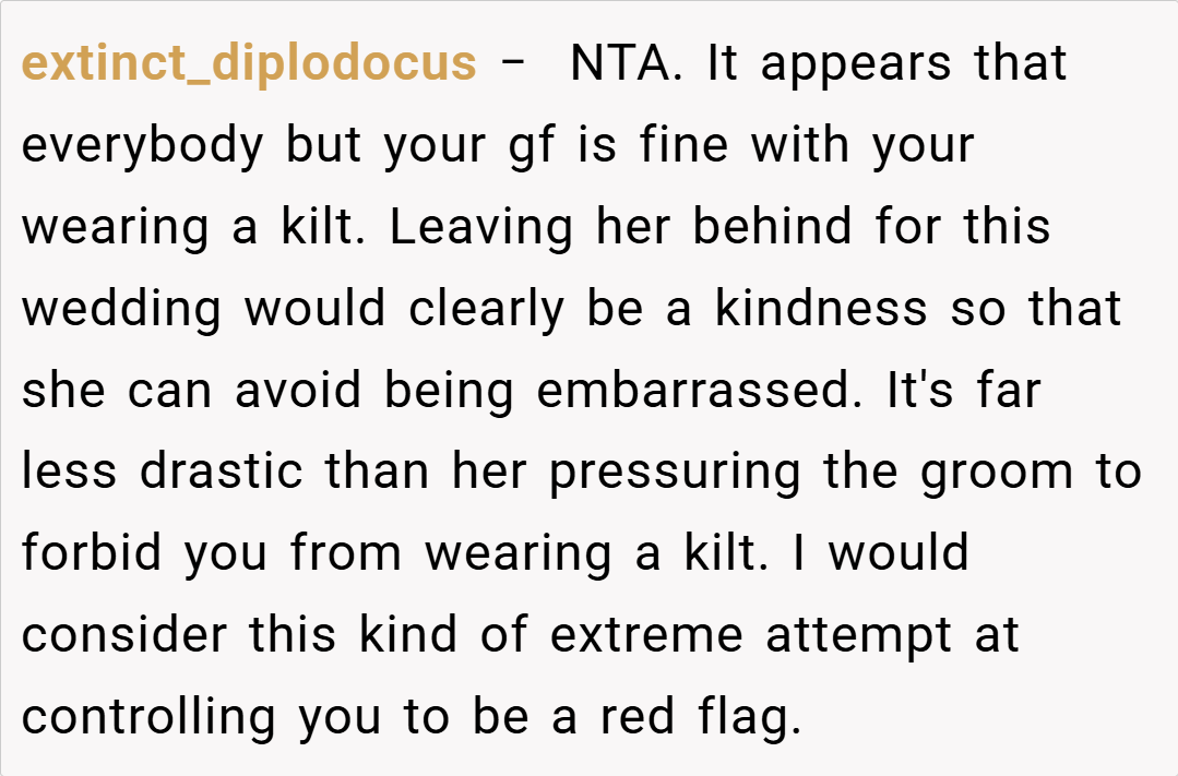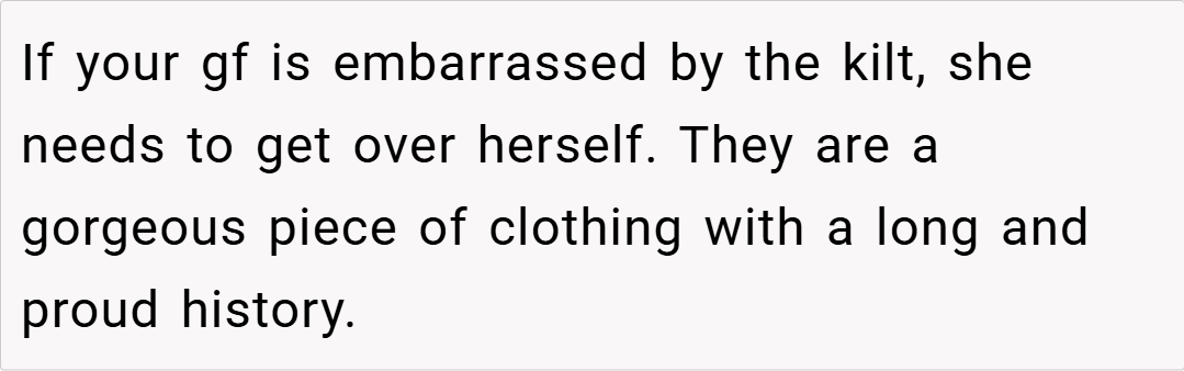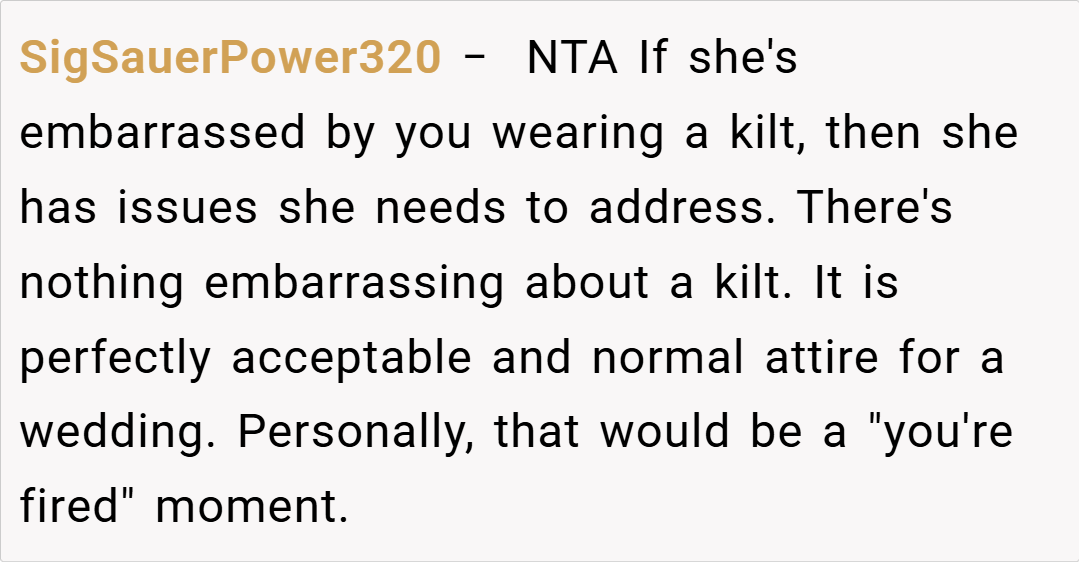 The consensus among Redditors is clear: you’re in the right for wanting to wear your kilt. Commenters agree that as long as your attire complies with the wedding guidelines, your choice should be respected. Many express that your girlfriend’s objections seem rooted in personal insecurities and a conservative background, rather than any legitimate concern about appropriateness.