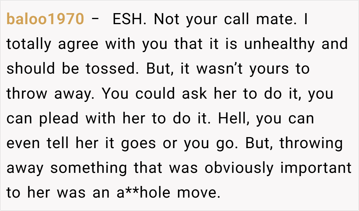 - Team Sentiment: “YTA. It’s her property. He could’ve hidden it instead of trashing it.”