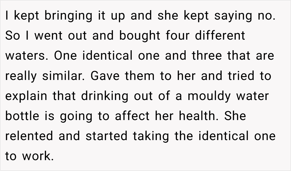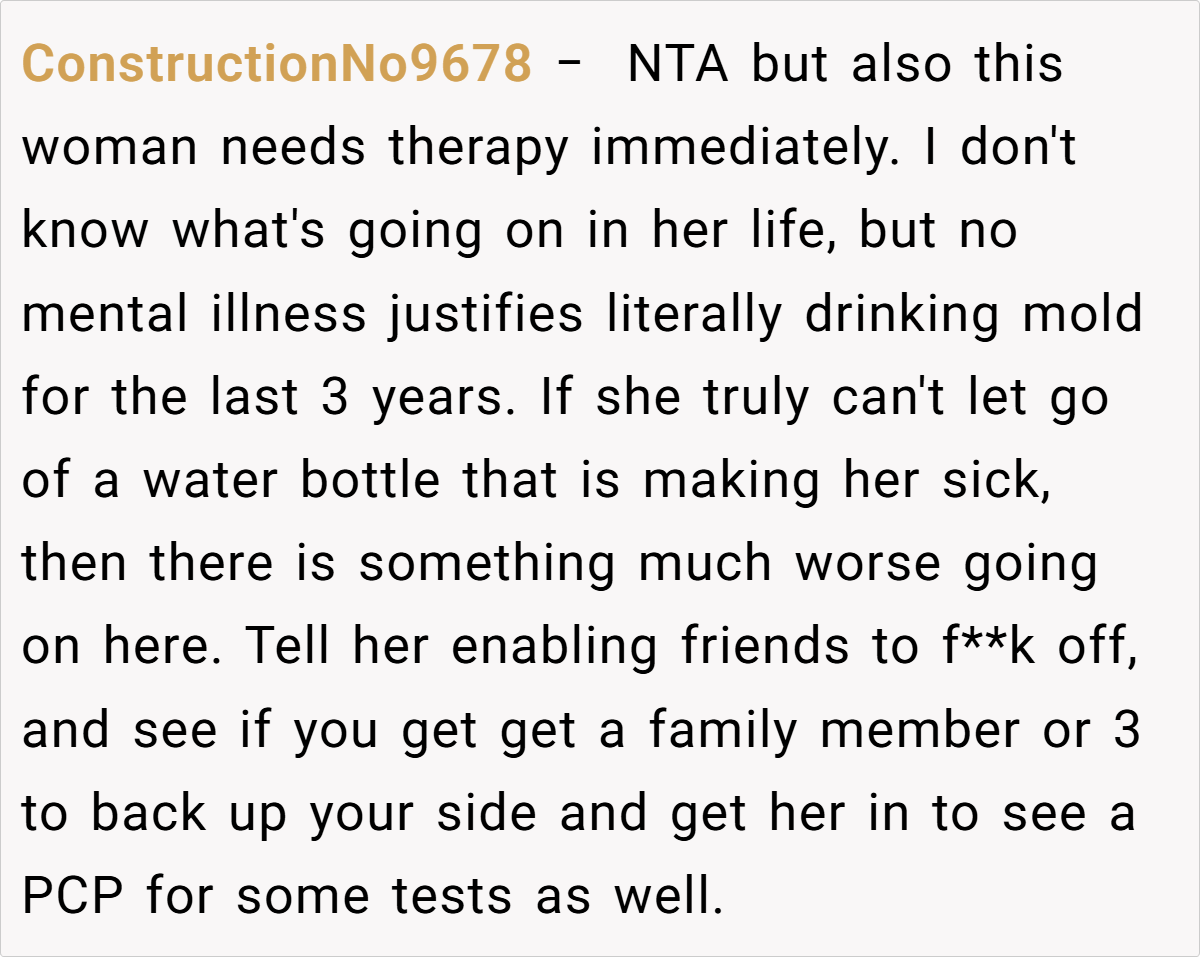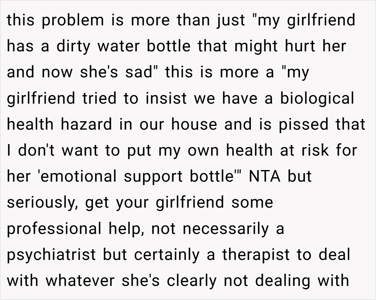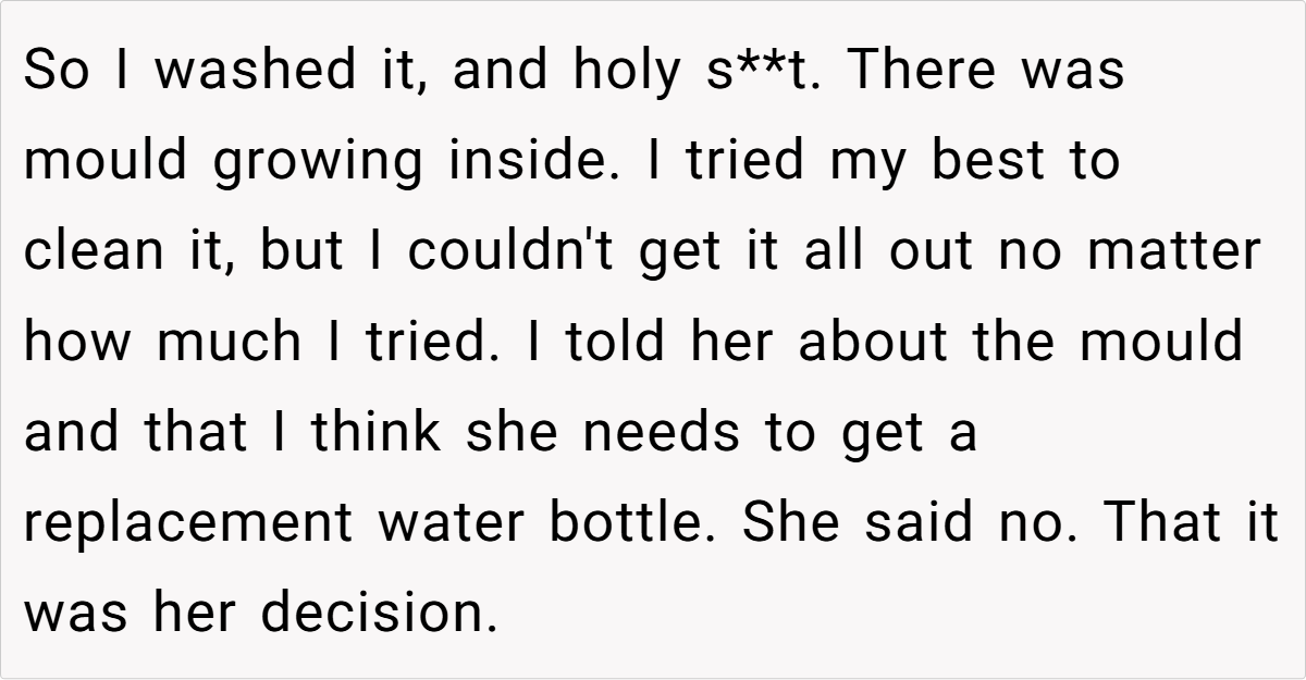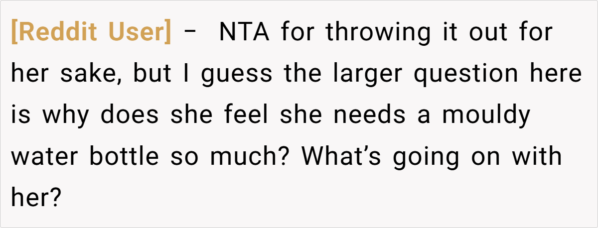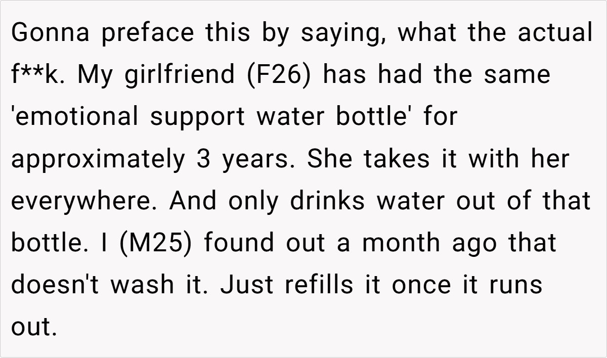 A 25-year-old man faces backlash after throwing away his girlfriend’s (26F) cherished, mold-infested water bottle—a three-year emotional support object she refuses to wash. While her family supports his health-driven decision, her friends condemn it as disrespectful. The clash pits practicality against sentimental value, raising questions about autonomy and care in relationships.