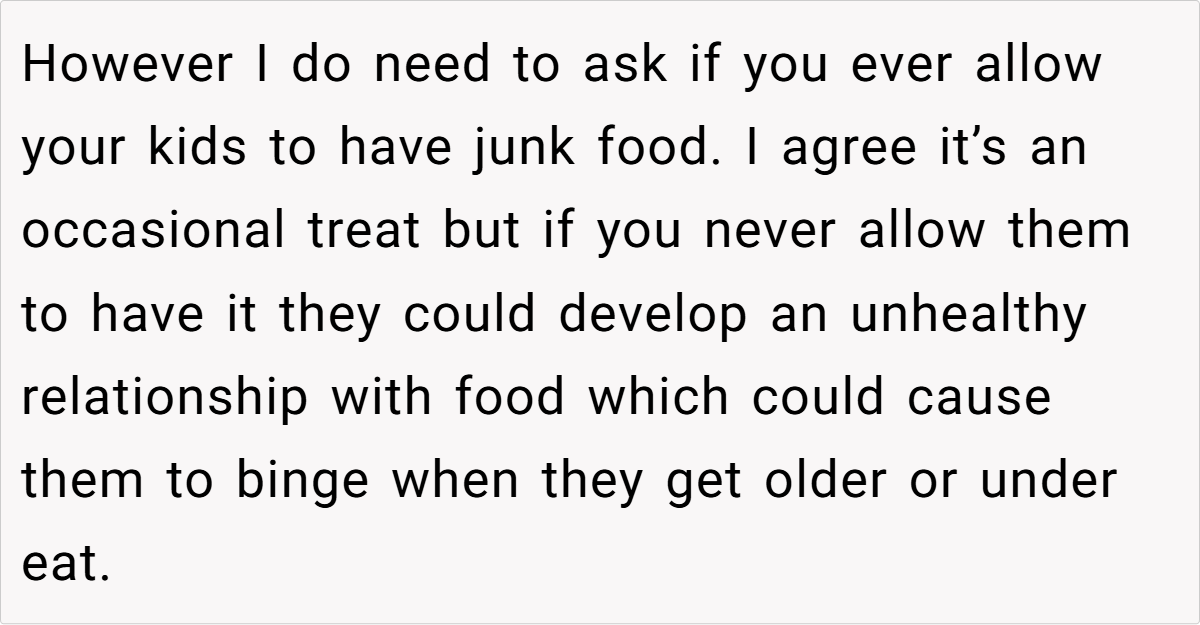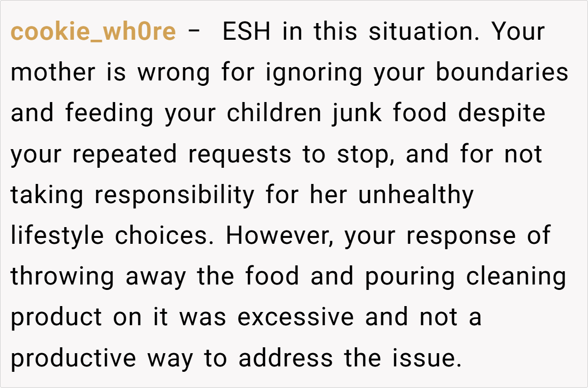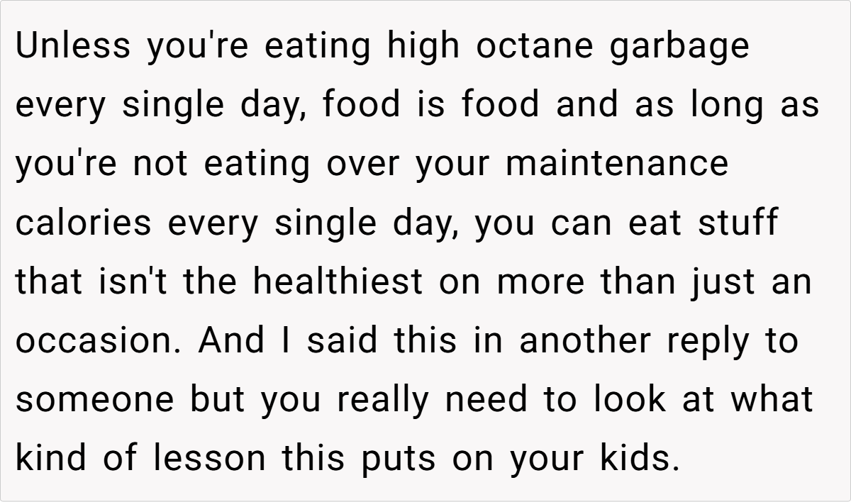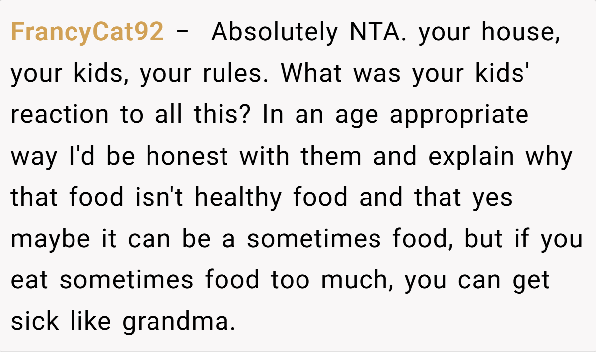 Most commenters agree that the parent’s actions are justified. They emphasize that as the guardian, the parent has the right to set dietary boundaries in their home. Many point out that repeatedly serving junk food to children, especially after prior warnings, crosses the line between indulgence and negligence.