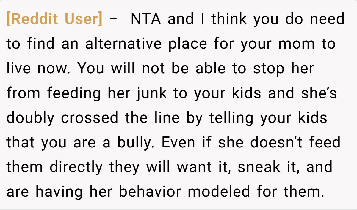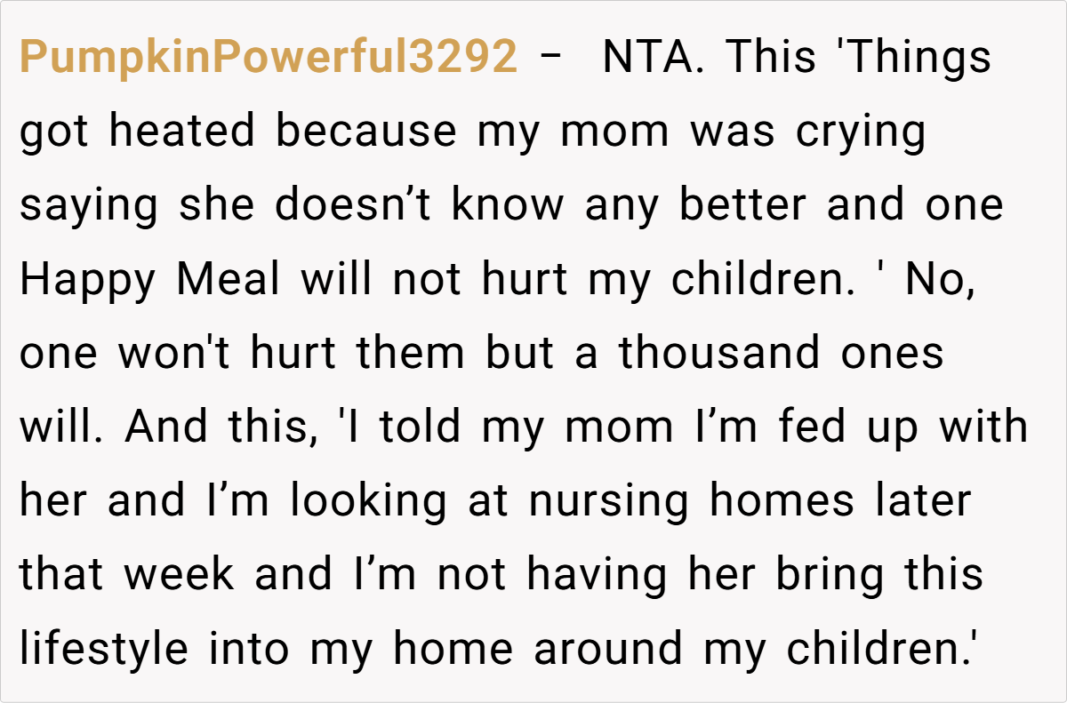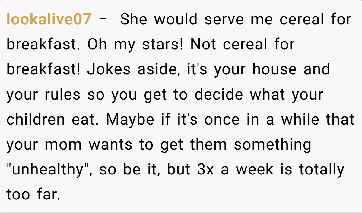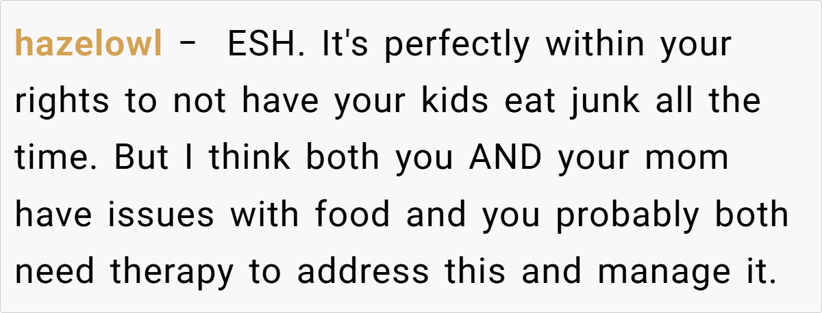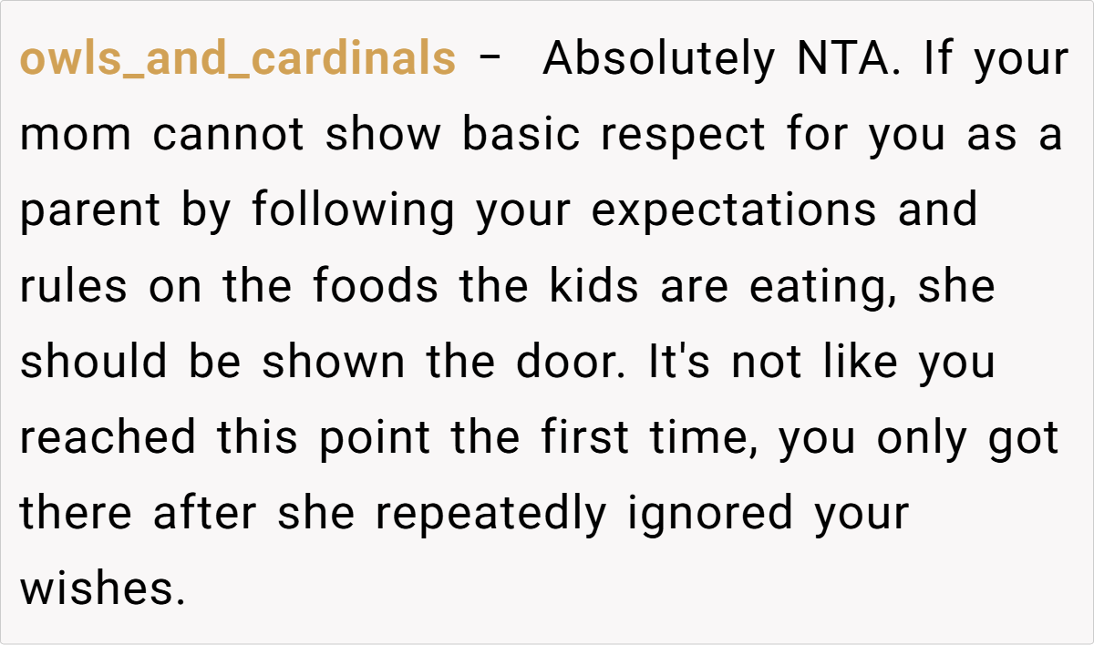 Most commenters agree that the parent’s actions are justified. They emphasize that as the guardian, the parent has the right to set dietary boundaries in their home. Many point out that repeatedly serving junk food to children, especially after prior warnings, crosses the line between indulgence and negligence.