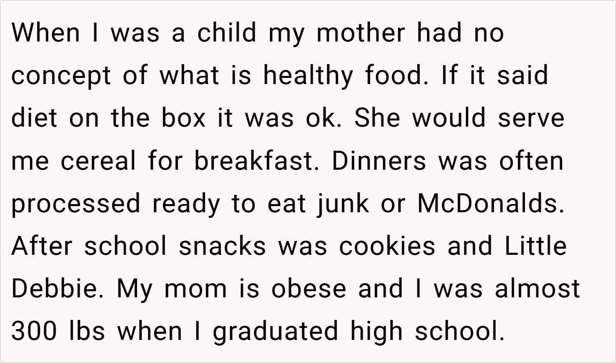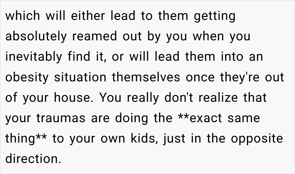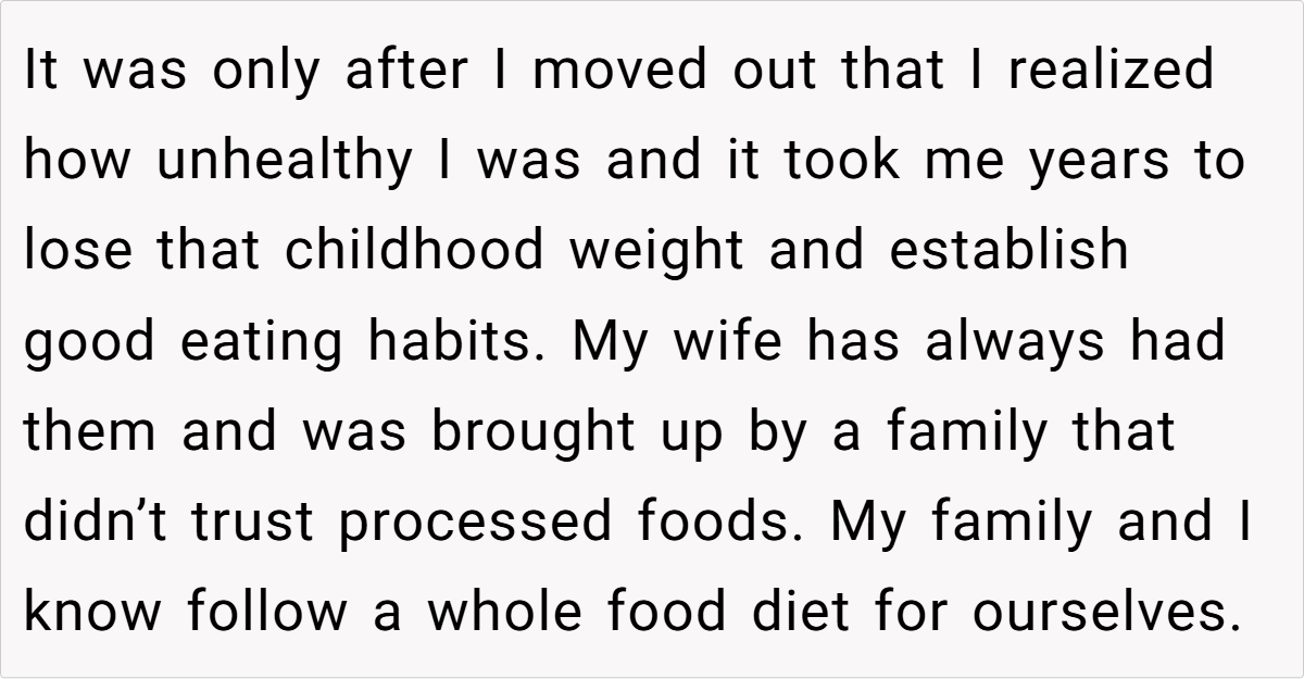 The decision to enforce strict dietary rules at home stems from painful memories of a childhood marked by poor eating habits and health struggles. With their own journey toward a whole food diet still fresh in mind, the parent finds it necessary to draw a firm line against the unhealthy offerings that keep reappearing.