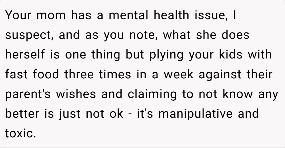 Family meals can be a source of joy and tradition, but when unhealthy habits collide with parental boundaries, tensions can run high. In this story, a parent recounts the challenges of protecting their children’s health while dealing with a grandparent whose lifelong reliance on processed junk food is jeopardizing the well-being of the next generation.