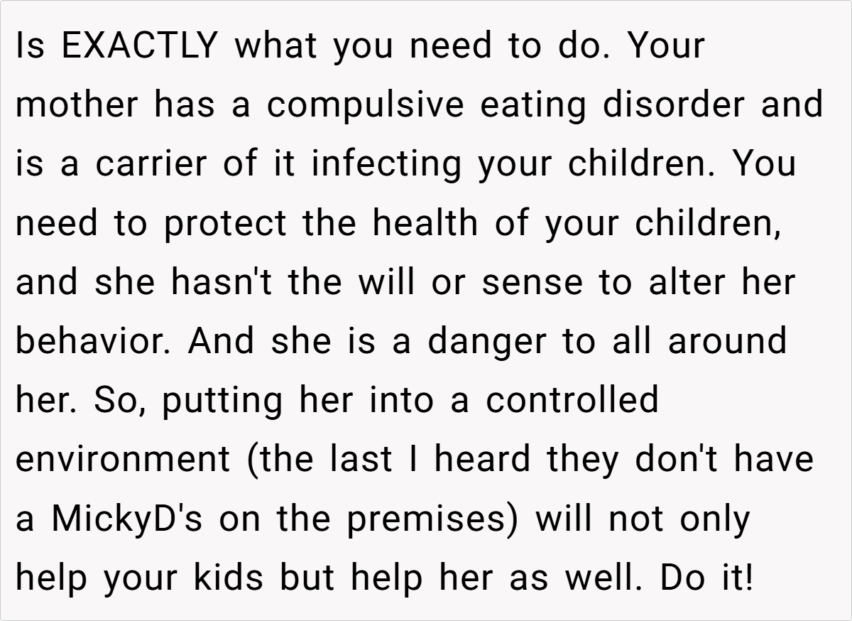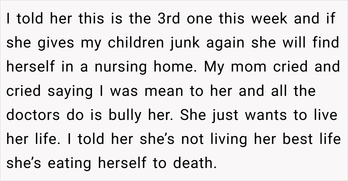 In this instance, the parent’s outburst against the grandparent’s behavior has undoubtedly strained their relationship, but it also underscores the urgency of the situation. The incident serves as a wake-up call for all involved, highlighting the need for a unified approach toward healthier eating practices that benefit everyone in the household.