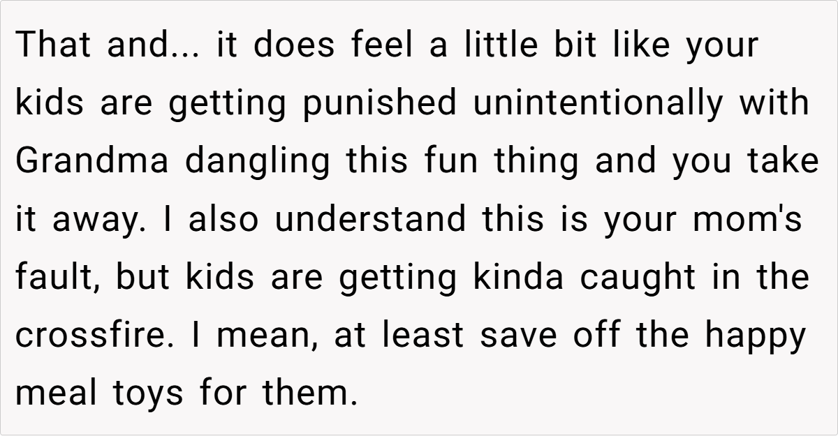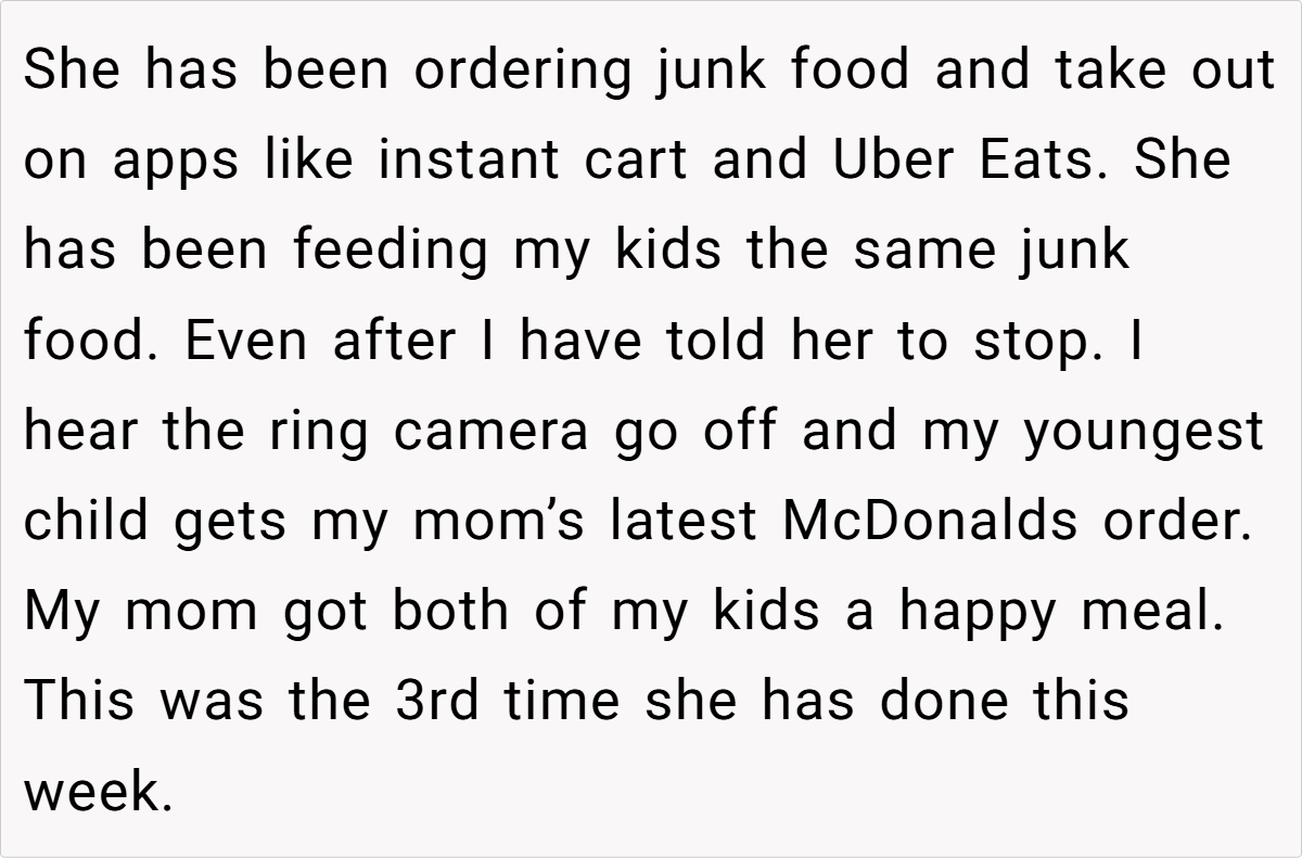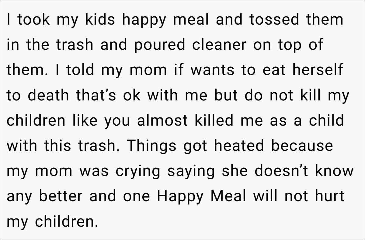 The conflict reached a boiling point when the grandparent, despite repeated warnings, delivered yet another round of fast-food Happy Meals to the children. In a moment of exasperation, the parent took drastic action—disposing of the meals in a way that would underscore the seriousness of the matter. This incident not only highlights the clash between old habits and new priorities but also raises the question of how far one should go to ensure a healthier future for their children.