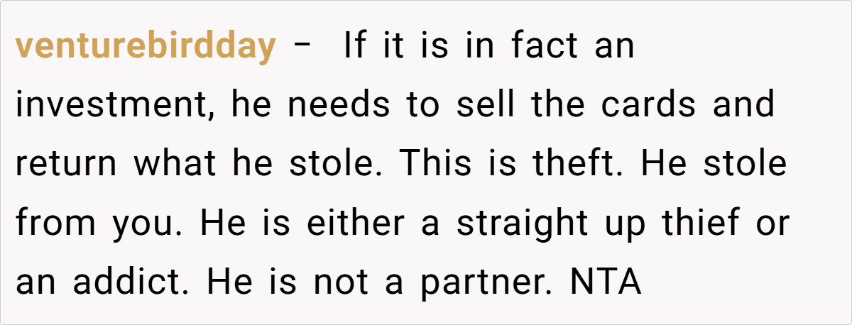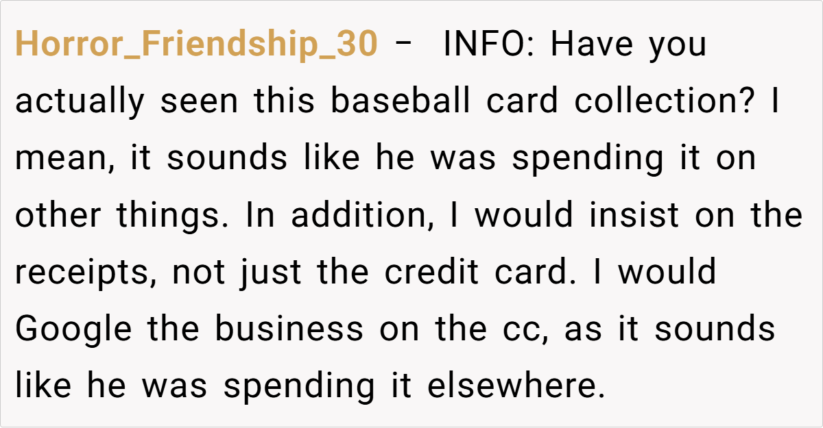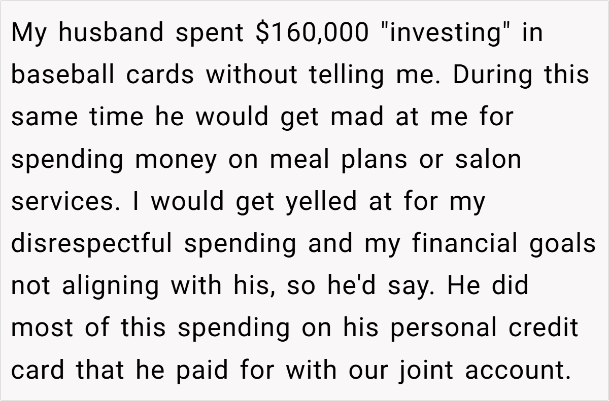 In any relationship, money matters can be a silent battleground. When one partner makes secretive financial decisions, it can erode trust and leave the other feeling powerless. The post we’re discussing highlights the tension of discovering a spouse’s hidden $160,000 spend on baseball cards—a discovery that forces a desperate attempt to reclaim one’s rightful share. Such revelations not only spark personal turmoil but also shine a light on broader issues of financial control and abuse.