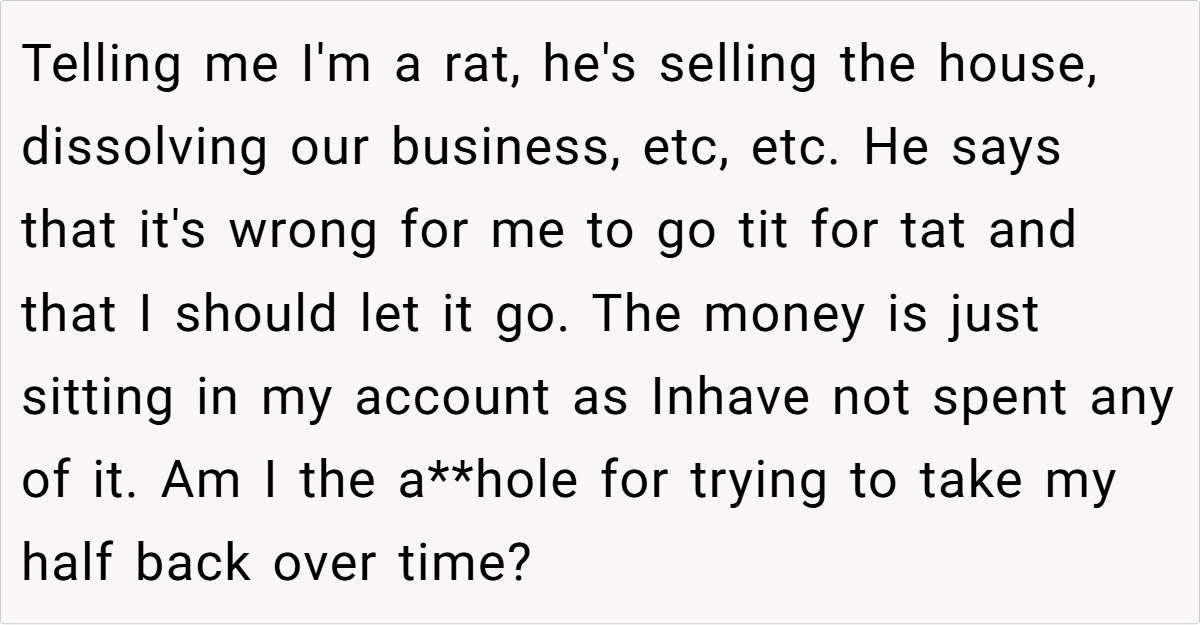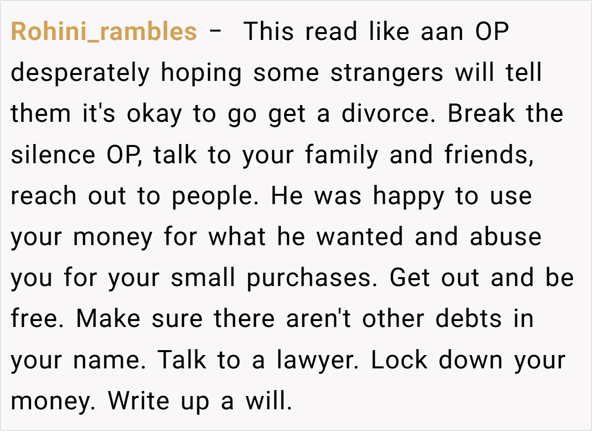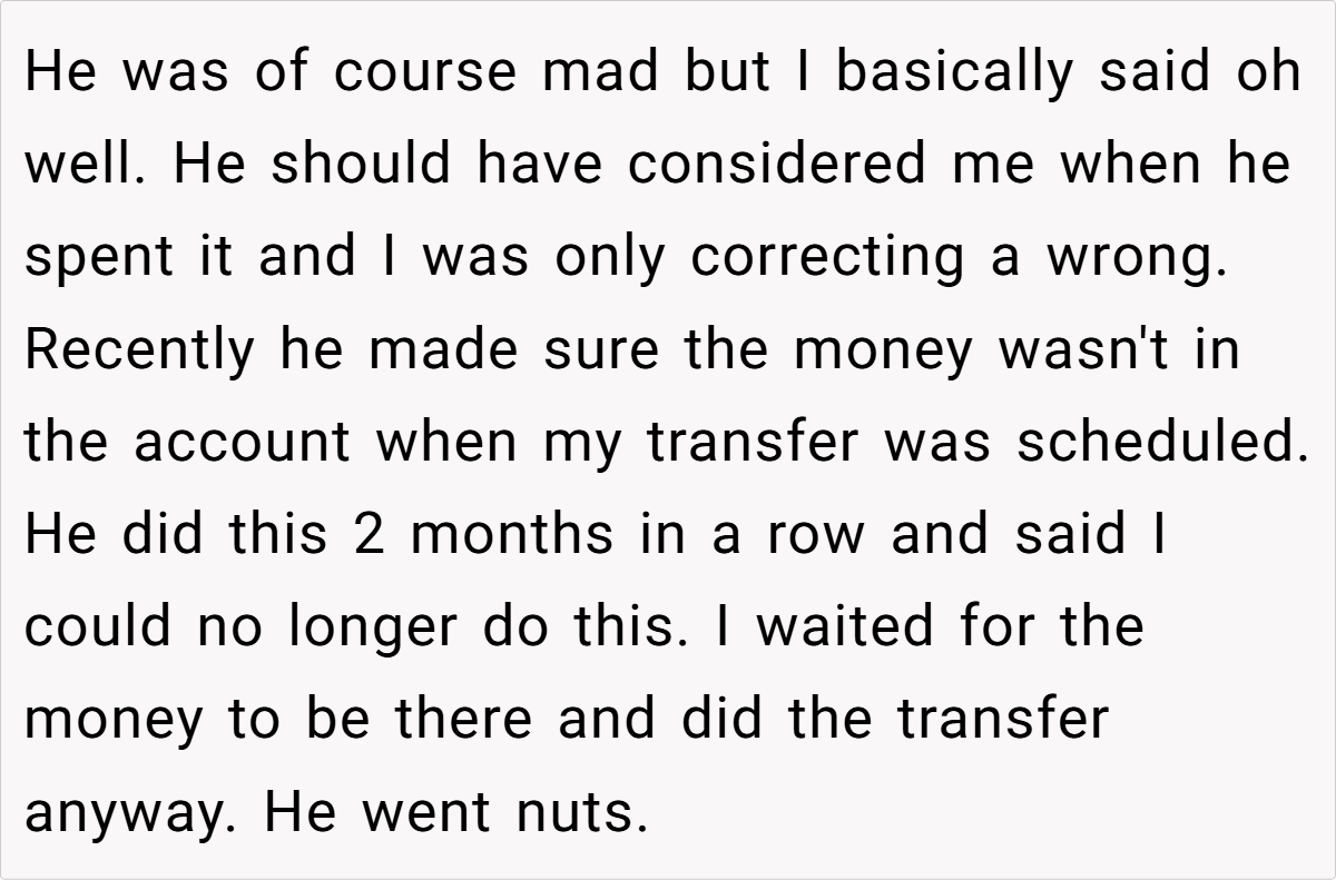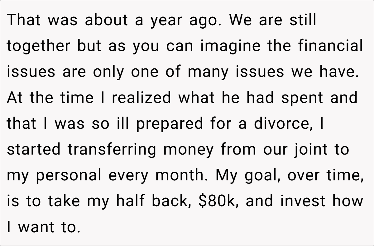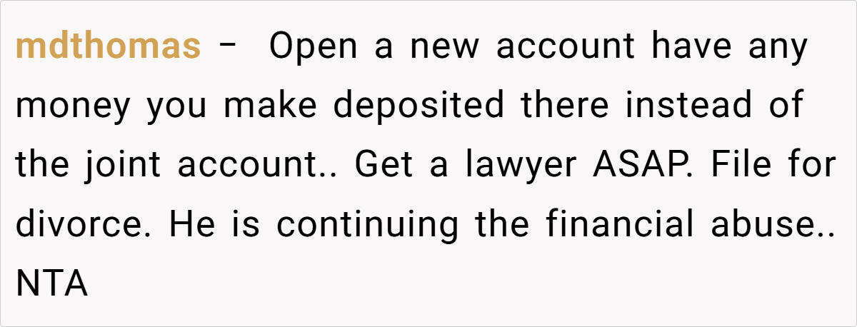 Community members express empathy and share real-life experiences, emphasizing that transferring funds from a joint account to a personal account can be a necessary step to restore fairness in the face of financial abuse. They advise seeking professional advice to ensure actions are legally sound while underlining the importance of transparency and open communication in managing shared finances. Overall, the consensus is that reclaiming financial autonomy is essential for protecting one’s rights and preventing further exploitation.