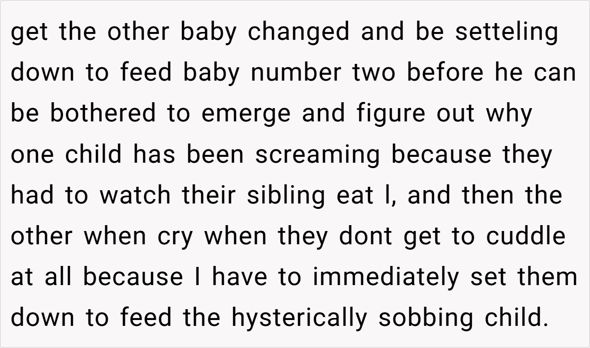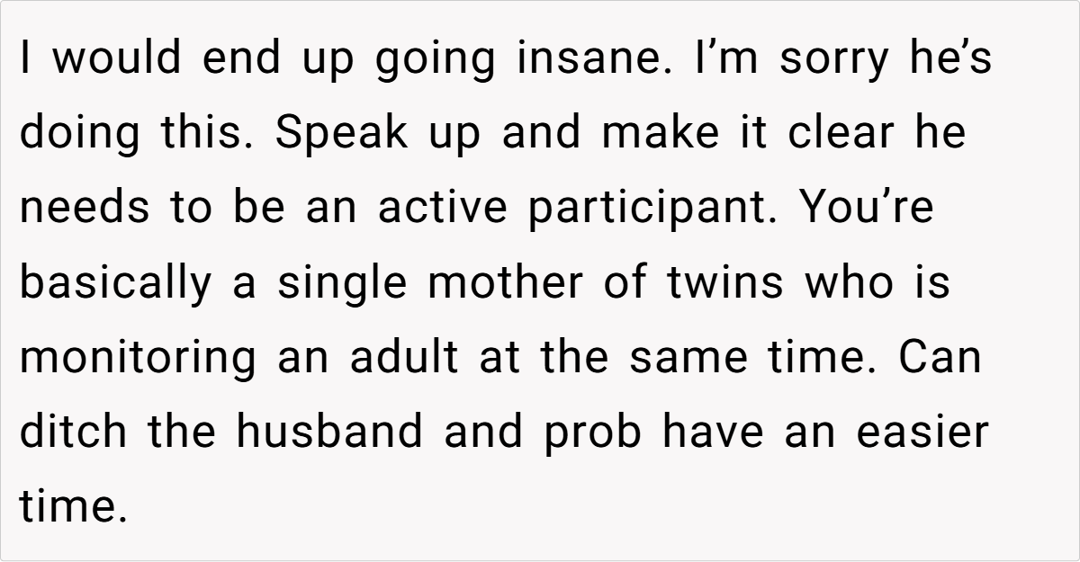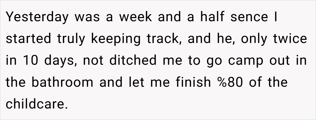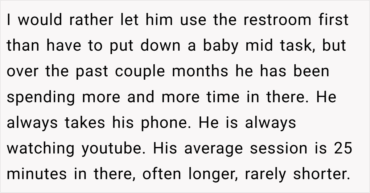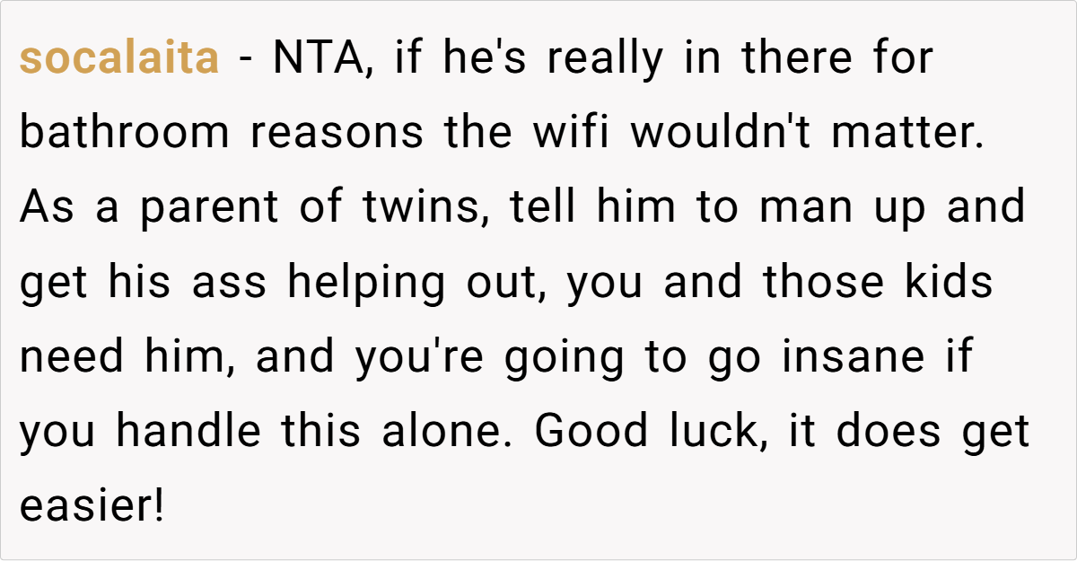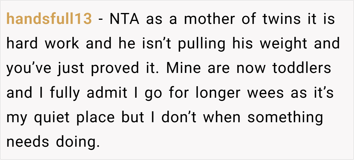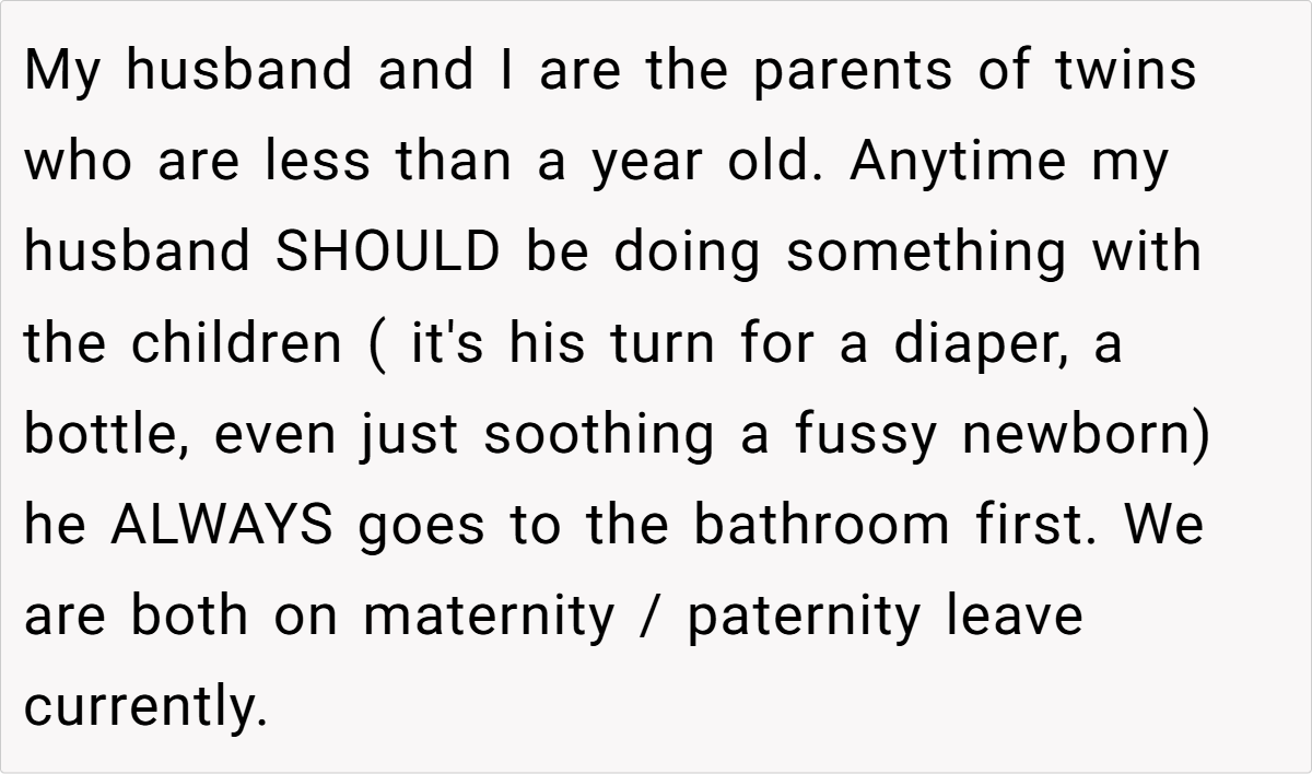 Parenting twins is no easy feat, especially when one partner isn’t pulling their weight. One Redditor shared her frustration about her husband, who consistently disappears into the bathroom every time it’s his turn to help with childcare.
