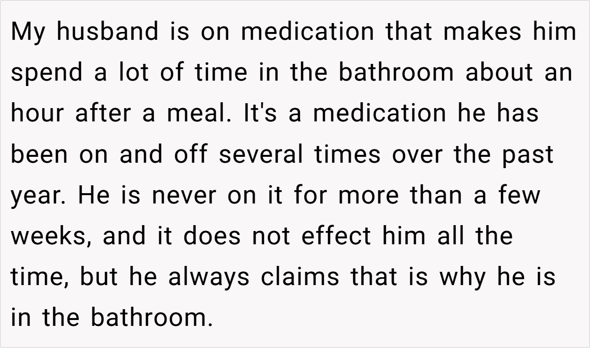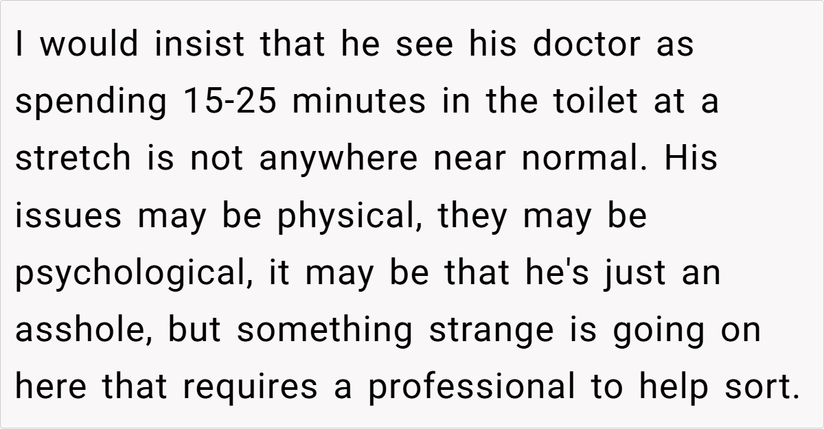 While OP’s husband claims a medication is causing his extended bathroom visits, he refuses to see a doctor despite OP’s encouragement. Dr. Mark Hyman, a leading physician in digestive health, states, “If a medication or health issue is leading to persistent and disruptive digestive problems, seeking medical evaluation is necessary.”