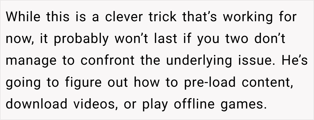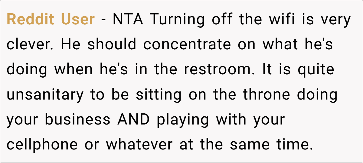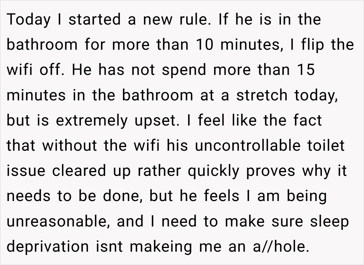 OP suspected he was using it as an escape, and after monitoring his habits, she decided to turn off the Wi-Fi to see if his “medical issue” suddenly improved. Now, her husband is furious, and OP wonders—was this a reasonable way to handle the situation, or did she take it too far?