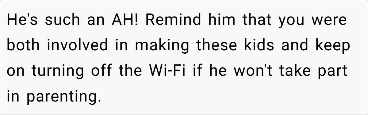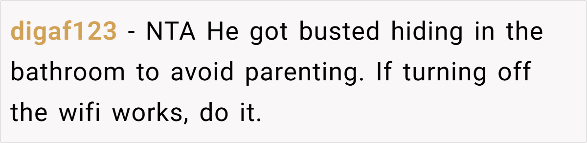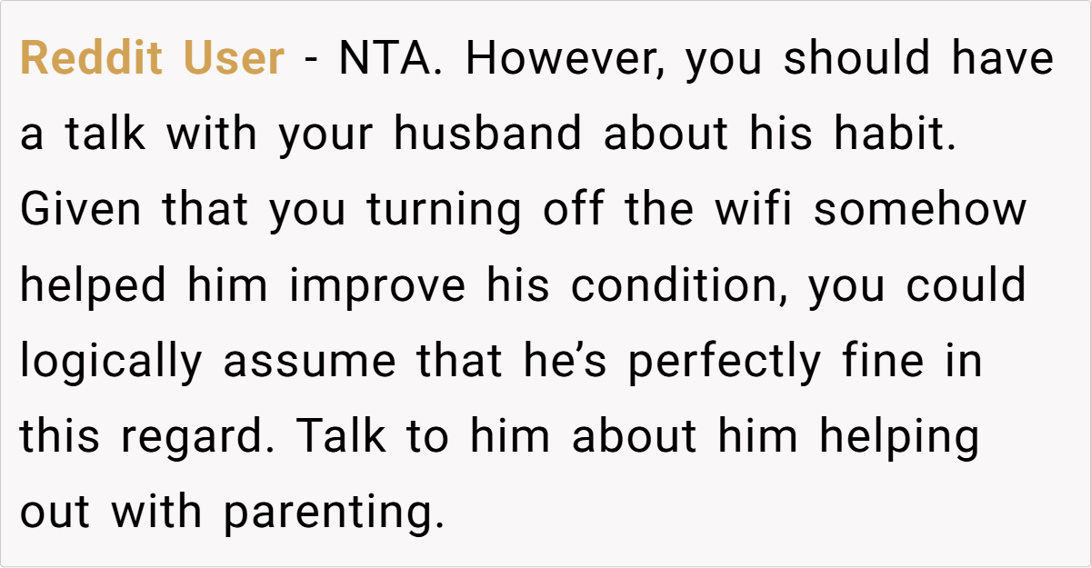 Most agree that OP’s husband is shirking his responsibilities, and cutting the Wi-Fi successfully revealed the real issue. However, some argue that direct communication would have been a more mature approach than using a tech restriction to force compliance.