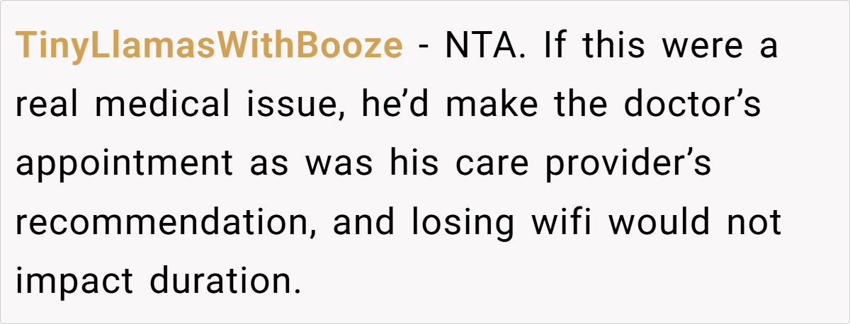 Many Redditors sided with OP, believing that the Wi-Fi shutdown proved the husband was exaggerating his symptoms. Others suggested that OP’s approach, while effective, could have been more communicative and less confrontational.