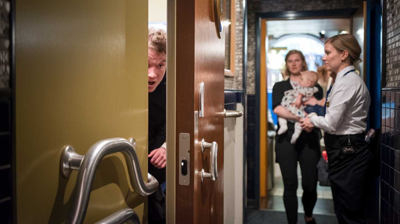 She’s not angry about the baby. She’s angry about the time that’s being taken away from her own night out and probably ruminating that this change should have been her husband’s turn. If you could have made it upstairs, you probably should’ve gone there. Ultimately it’s a pub bathroom.