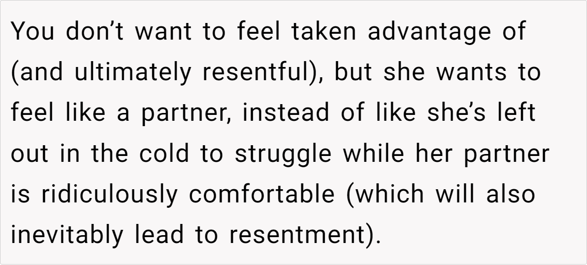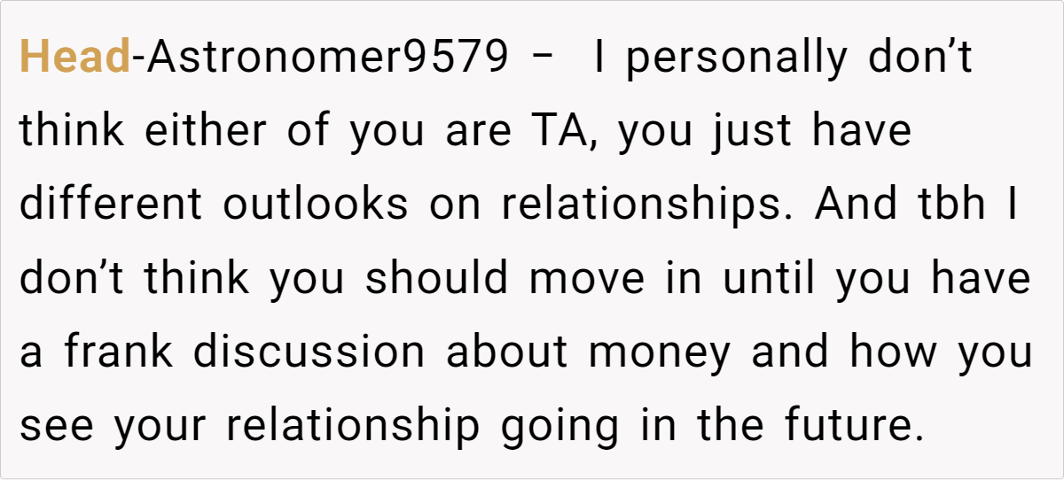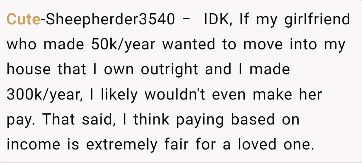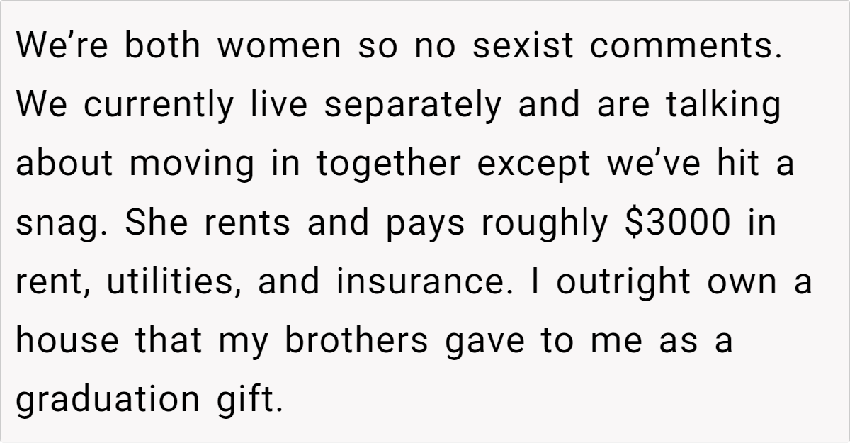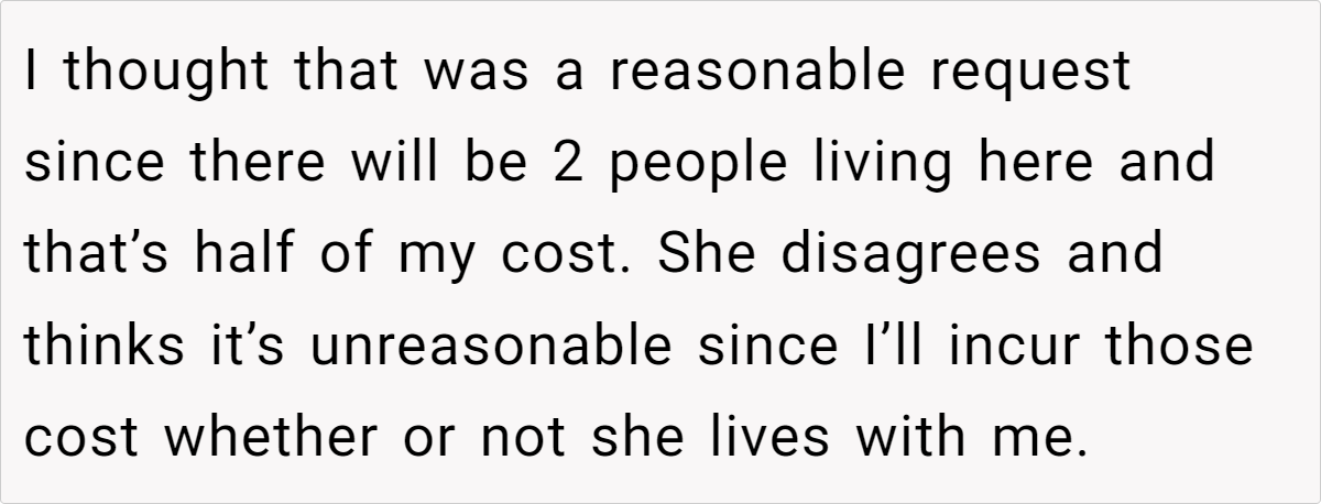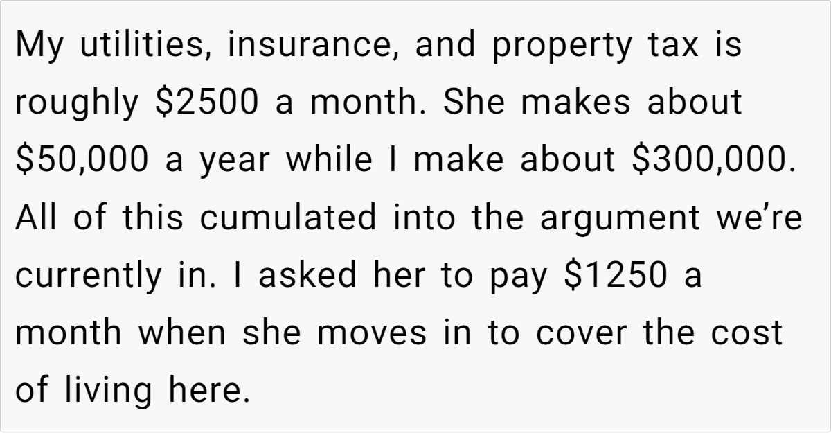 A Redditor shares a financial dilemma regarding her girlfriend moving in with her. After proposing that her girlfriend contribute $1,250 per month to cover living expenses in her house, tensions arise when her girlfriend suggests a much lower amount based on their income disparity. This disagreement about fairness and financial responsibility brings their relationship into question. Read the original story below to see how this couple navigates their differing perspectives on money.