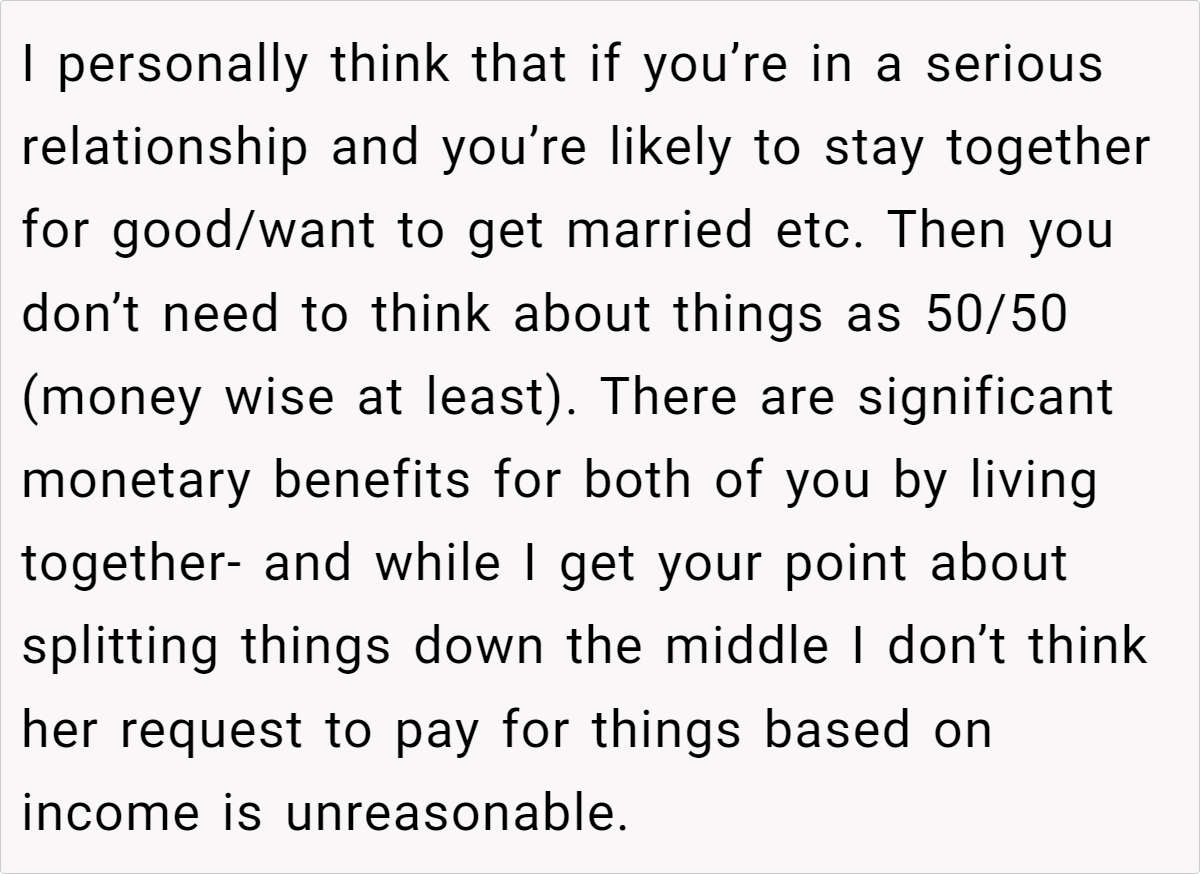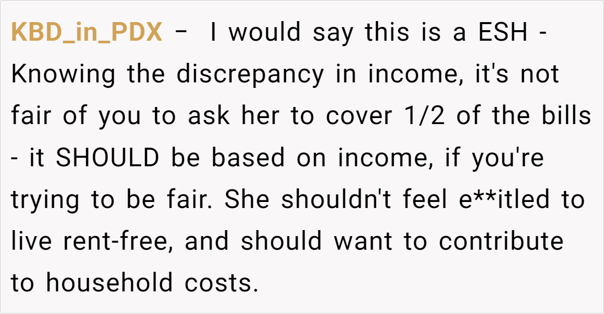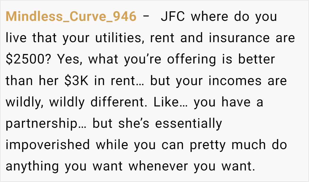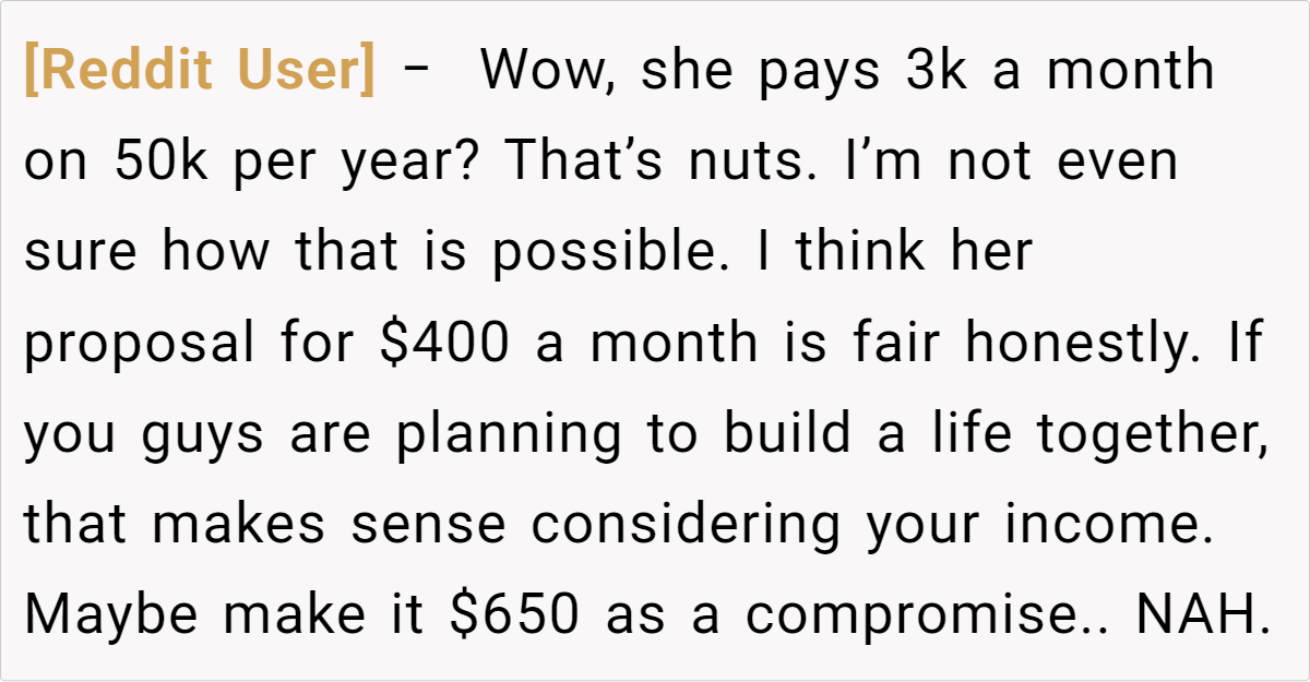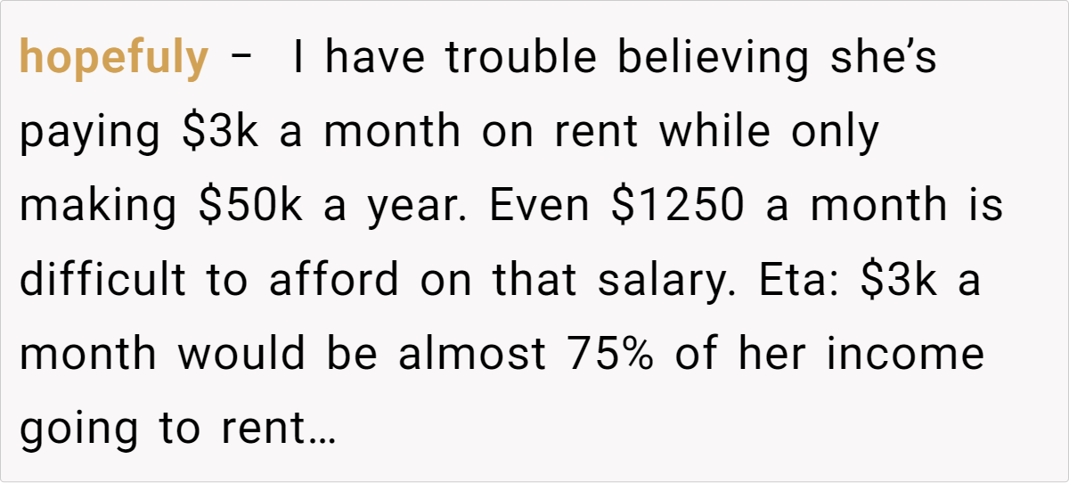 All the people commenting here and on original post need to realize that more than. Half the country makes 50k a year or less. Hopefully they live somewhere that is affordable. But if yoú live in California, and rent, this is the reality. Rent is disproportional. You live on pennies. Ok. Now opinion on post: this is a privileged lesbian who is dating a salt of the earther and trying to take advantage. You are the a-hole.