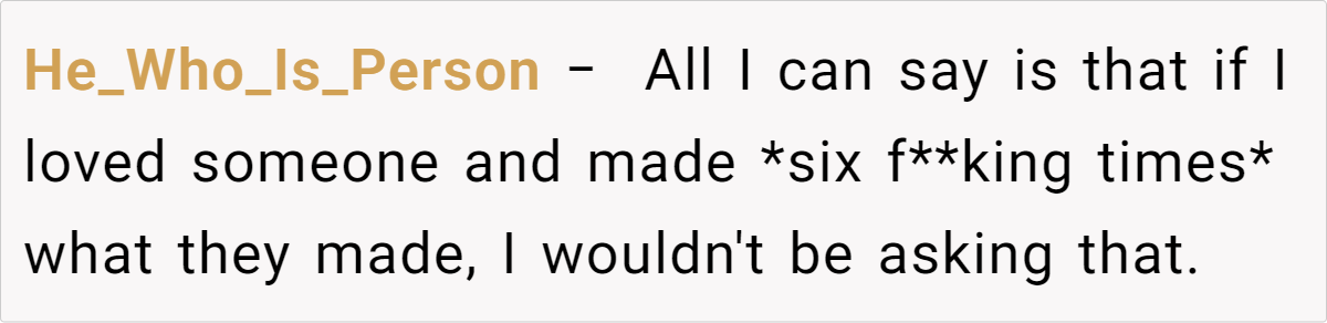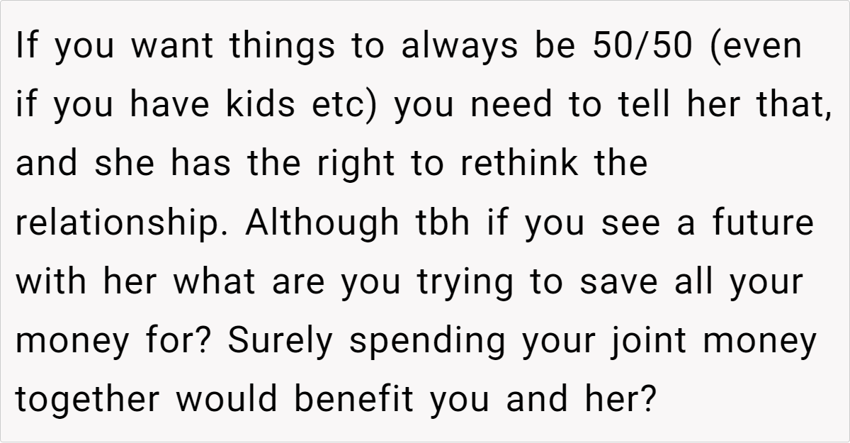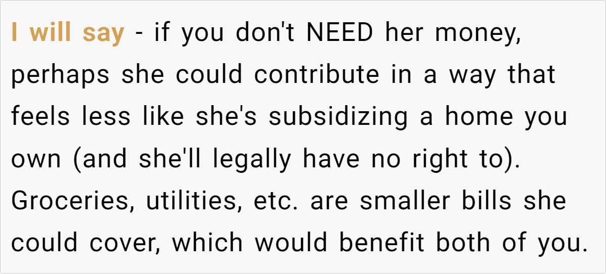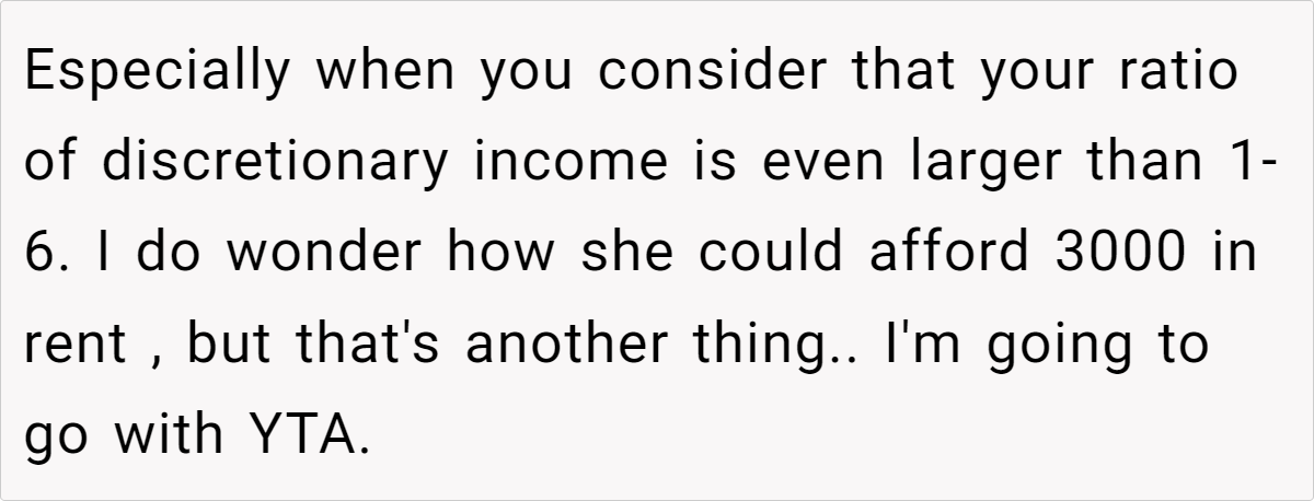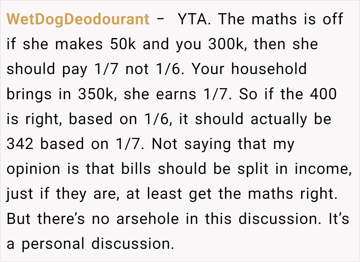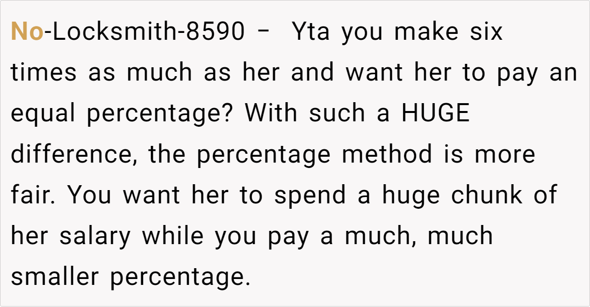 All the people commenting here and on original post need to realize that more than. Half the country makes 50k a year or less. Hopefully they live somewhere that is affordable. But if yoú live in California, and rent, this is the reality. Rent is disproportional. You live on pennies. Ok. Now opinion on post: this is a privileged lesbian who is dating a salt of the earther and trying to take advantage. You are the a-hole.