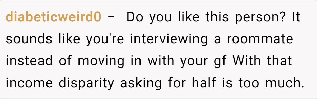 Do you think the user is justified in wanting her girlfriend to contribute a fair amount to household expenses, or is her girlfriend’s perspective about financial contribution based on their income disparity more reasonable? How would you approach financial discussions in a relationship where living arrangements change? Share your thoughts below!