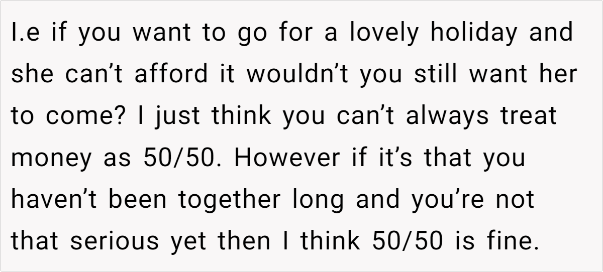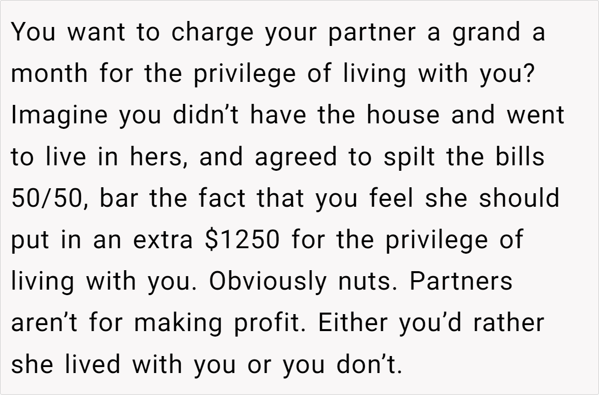 Just because the OP was gifted a house and makes loads more money, why should he have to carry her? If she can afford $3k now on her wages she should be grateful he is potentially giving her half of that back to spend on herself! If she cant afford it, she should be in a lower rental property. As much as everyone is saying ‘if he loved her he would want to support her’ , if she loved HIM she wouldn’t want to freeload!!
