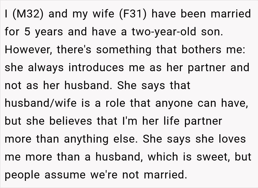 When it comes to the way we present our relationships to the world, words can carry a lot of emotional weight. Our OP, a 32‑year‑old woman, is troubled by the fact that her wife consistently introduces her as her “partner” instead of “husband.” While her wife insists that the term “partner” reflects a deeper, more egalitarian bond, OP feels that “husband” is a term imbued with commitment, loyalty, and a clear marital identity.