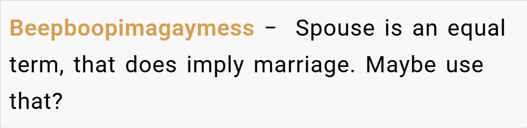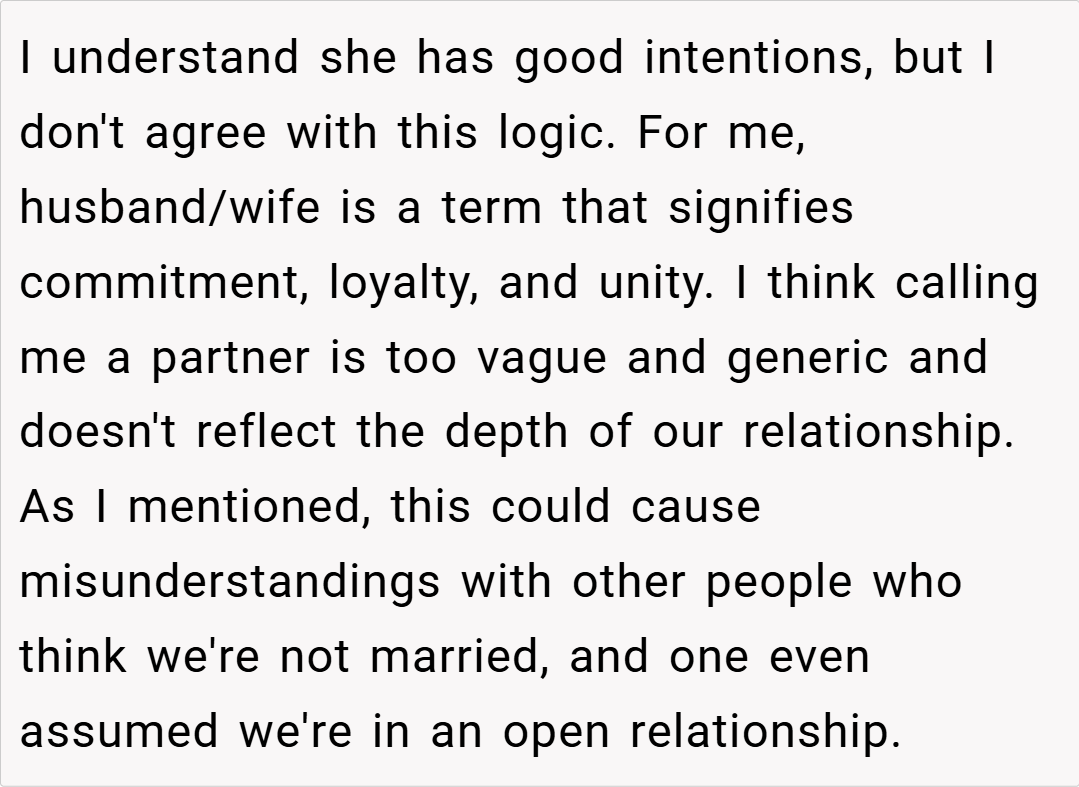 For her, being called “partner” seems vague and even leads to misunderstandings among others—people even mistakenly assume their relationship isn’t a marriage at all. Despite having discussed this issue multiple times, her wife remains steadfast, leaving OP feeling insecure and frustrated.