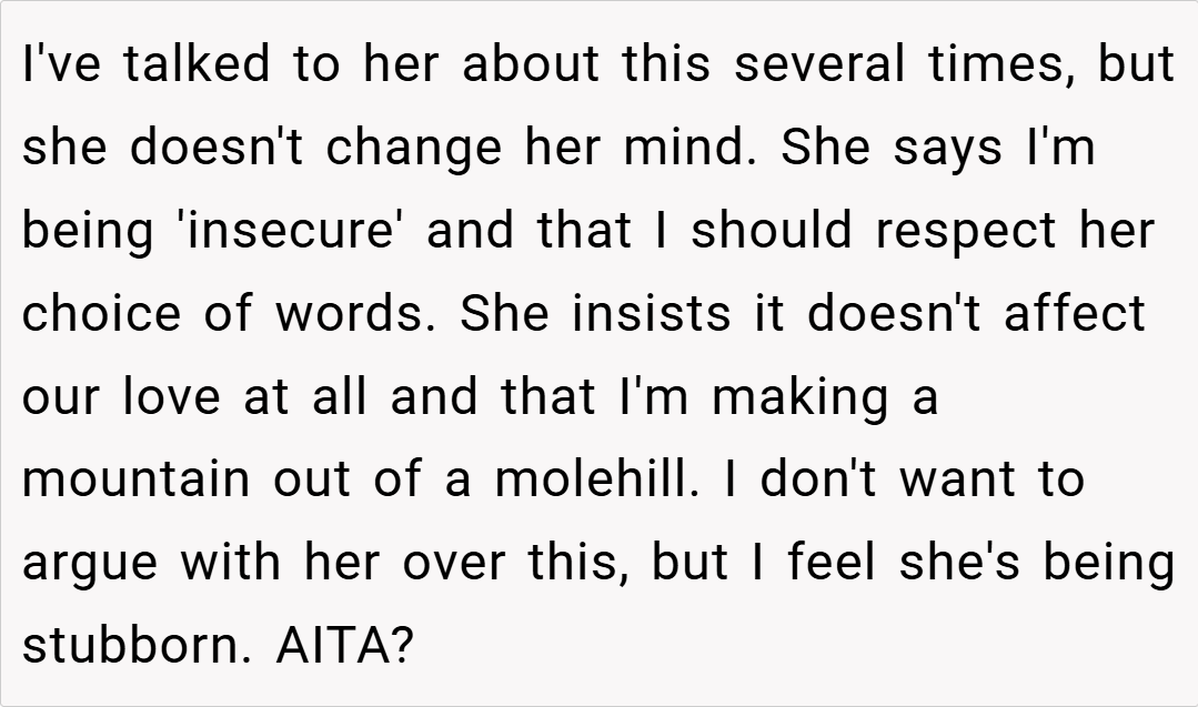 If the focus shifts from labels to the quality and strength of the relationship, then this dispute might seem trivial in hindsight. So, AITA? Many opinions suggest that while the OP is allowed to have her feelings, insisting on a particular term to validate one’s worth in a relationship may be more about personal insecurities than about a genuine issue.