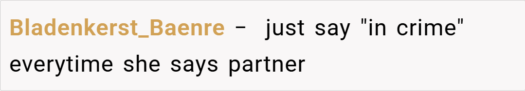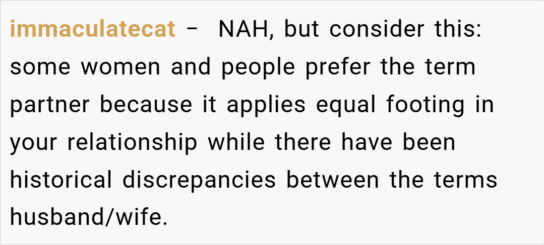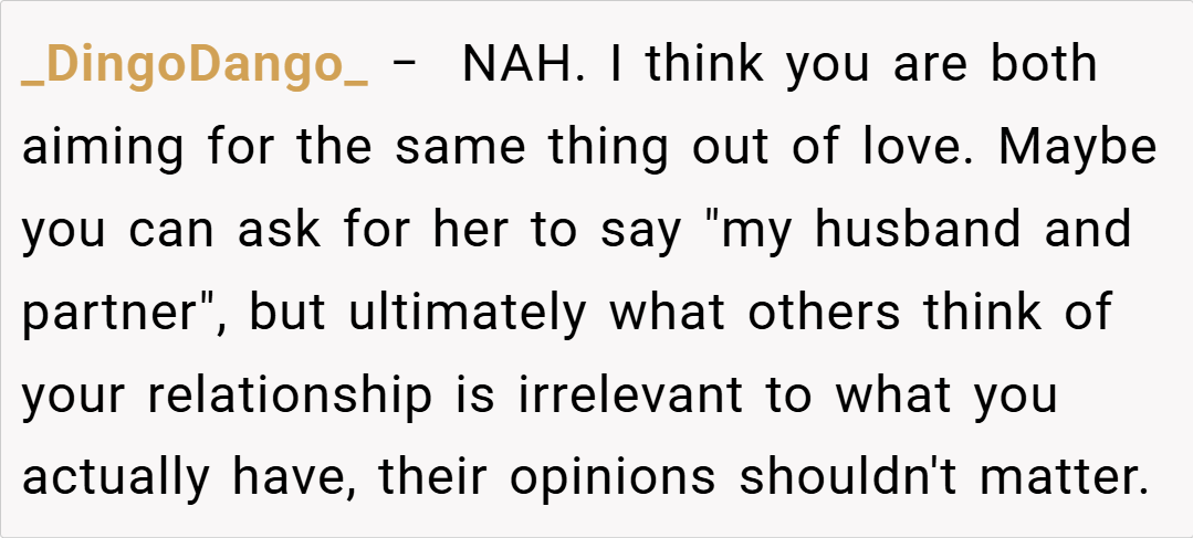 Ultimately, while the OP’s feelings are understandable given her personal values and the traditional meaning she associates with “husband,” her insistence on a specific label appears to be rooted in insecurity about public perception rather than a substantive issue in the relationship. Her wife’s choice to introduce her as “partner” reflects a modern perspective on relationships—one that many find equally valid.