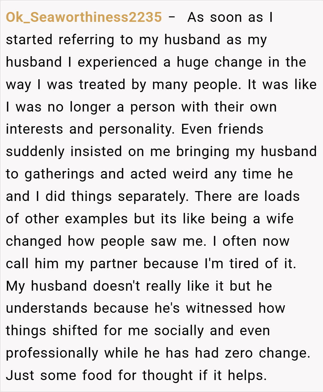 family therapist Dr. Susan Johnson emphasizes, “A marriage is about mutual respect and understanding. While it’s perfectly valid for someone to cherish traditional labels, insisting on them in a way that invalidates the other’s perspective can create unnecessary conflict. The focus should be on the quality of the relationship rather than the semantics of introductions.” Dr. Johnson suggests that if OP’s discomfort is primarily about public perception,