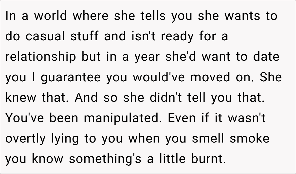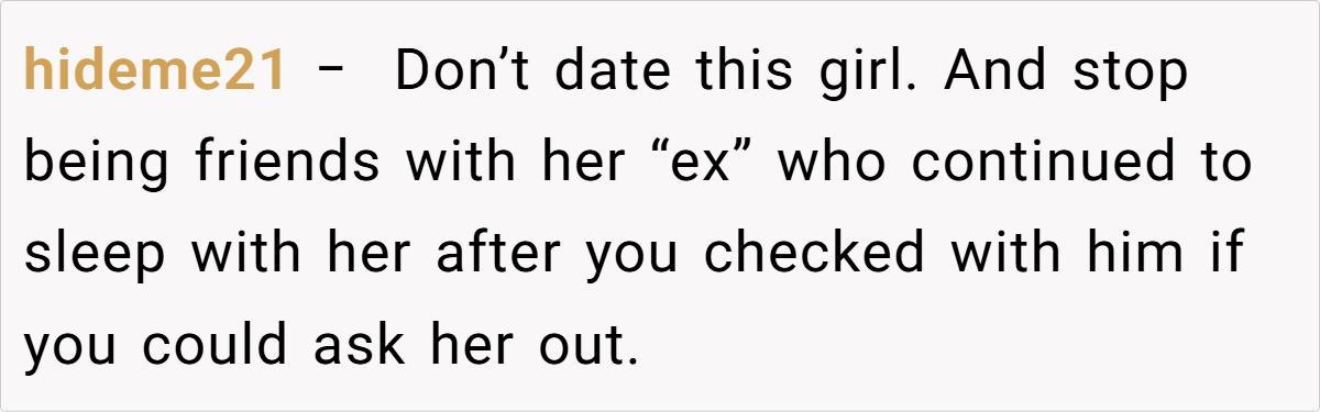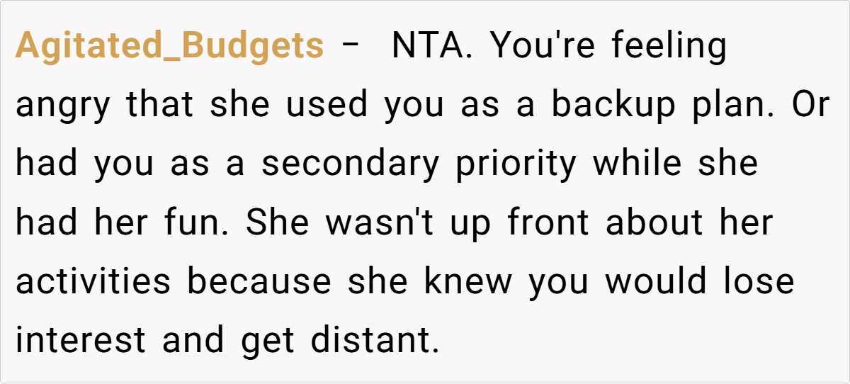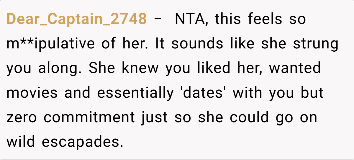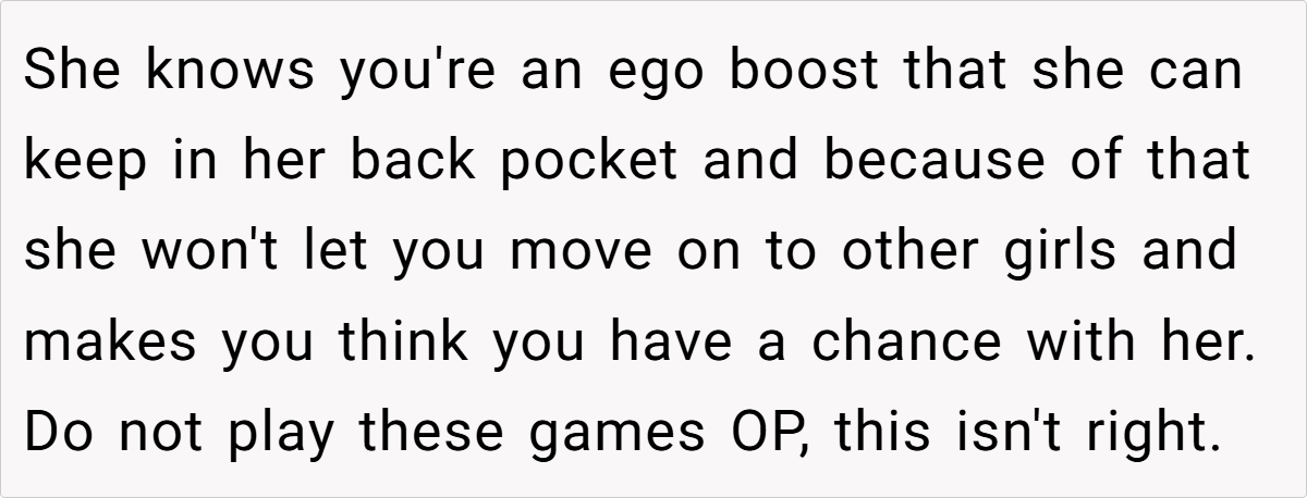 You’re her backup guy. Never be put on a backburner. I’ve flat told girls like this, if you like me we can date and give it a shot, if not I’m moving on with my life. My current GF/fiancé saw me for a while about 5 years ago, and went back to her ex. She finally broke up with him, and immediately texted me. She asked for a picture of me and I had actually slept with another girl the night before and sent her a picture of me with a bunch of hickies all over my neck that I was unaware of being there. She didn’t even mention it and made plans to hang out with me ASAP. I did the right thing and immediately ceased talking to any other females. We sat down and I had the discussion with her that if she wanted to be with me she needed to be serious about it because I was throwing away other opportunities I had so that we could be together. We came to an agreement and became a couple. That’s how things work in a healthy relationship. It’s not a game. If you are anything but her first choice, if she’s not willing to throw away everybody else and put everything into a relationship with you right then, you need to walk away. Games will be played and someone will get their feelings hurt. You have wasted time on this girl already that could have been spent finding someone who actually loves you. You are not the AH, she is. Never sit on the backburner as a backup.