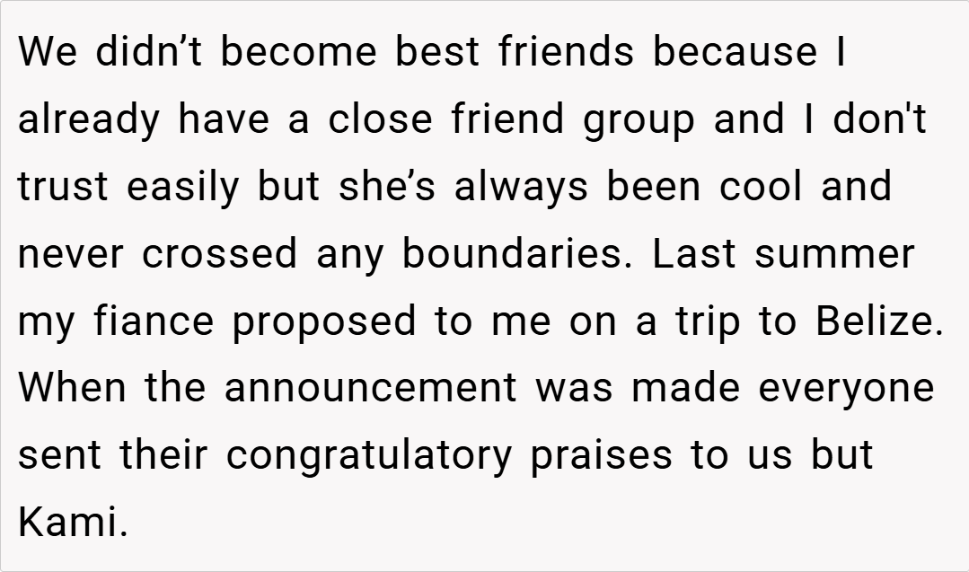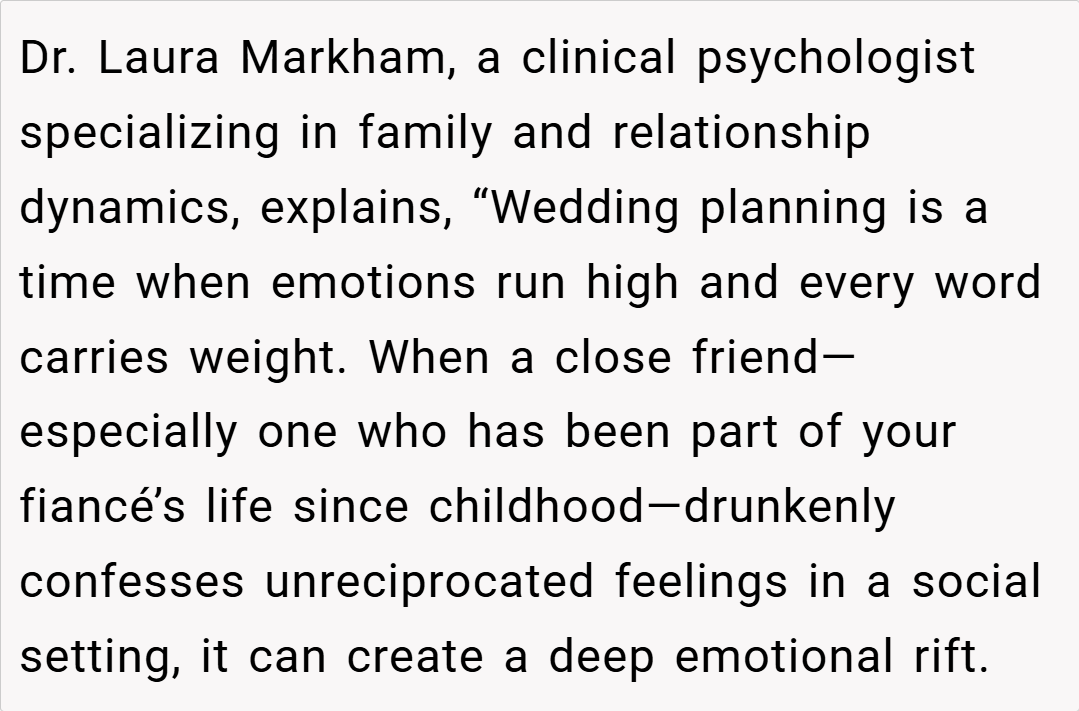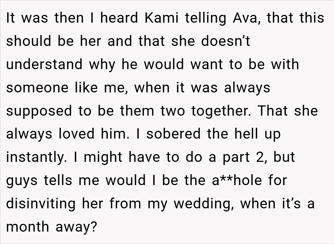 I’ve always considered my fiancé’s long-time friend as merely part of his extended family, even though I never really bonded with her. But hearing her claim that Elijah should be with her—and that he never truly belonged with me—left me heartbroken. Now, with our wedding just a month away, I’m seriously considering disinviting her from the celebration. I need to know: AITA for wanting to cut her out because of that drunken outburst?