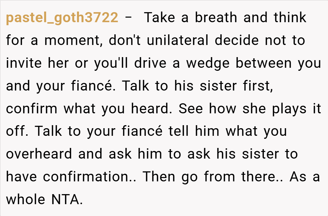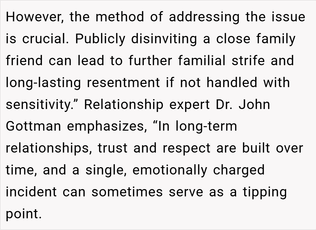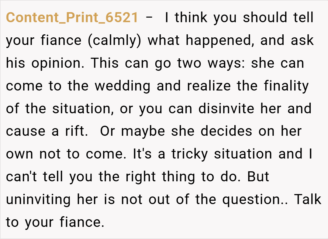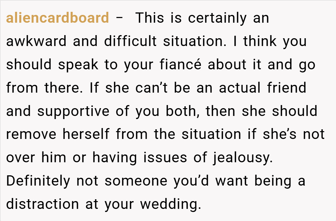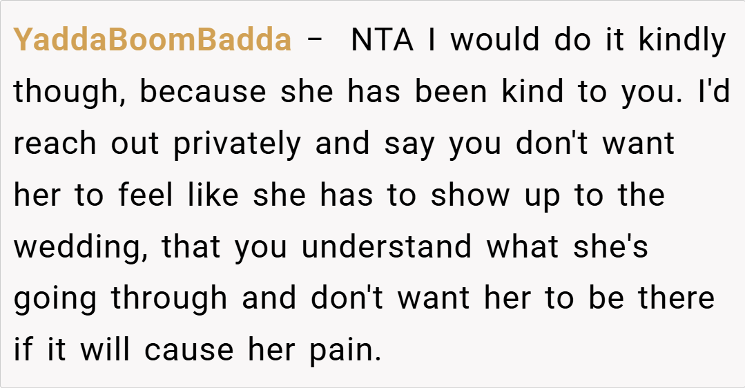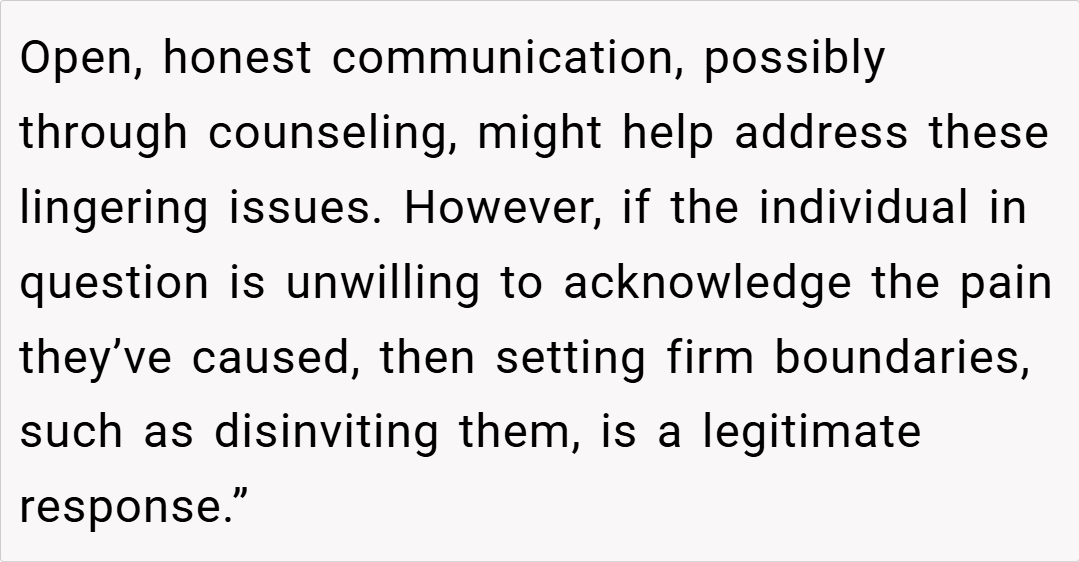 Several redditors expressed strong support for your decision. One user commented, “If someone you consider a part of your extended family blatantly disrespects your relationship in a drunken state, you’re not being petty for wanting them out of your wedding. Your day should be about celebrating love and commitment, not old, hurtful confessions.”