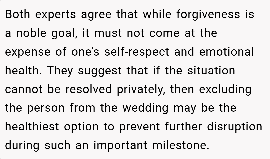 While it might seem harsh to cut someone out of a family event, your reaction is rooted in a deep sense of betrayal and the desire to ensure that your wedding day is not marred by unresolved past affections. This situation raises an important question: How do we balance forgiveness with the need to set firm boundaries when past wounds resurface during major life events?