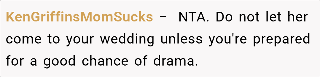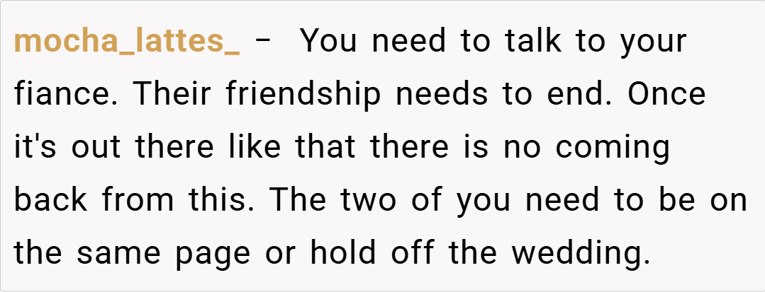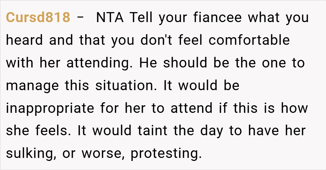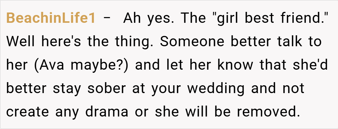 Another group shared personal experiences, with one commenter stating, “I’ve been in similar situations where a friend’s inappropriate behavior at a party forced me to set boundaries. You deserve to have a wedding where you feel secure and respected—disinviting her might be the only way to protect your peace of mind.”