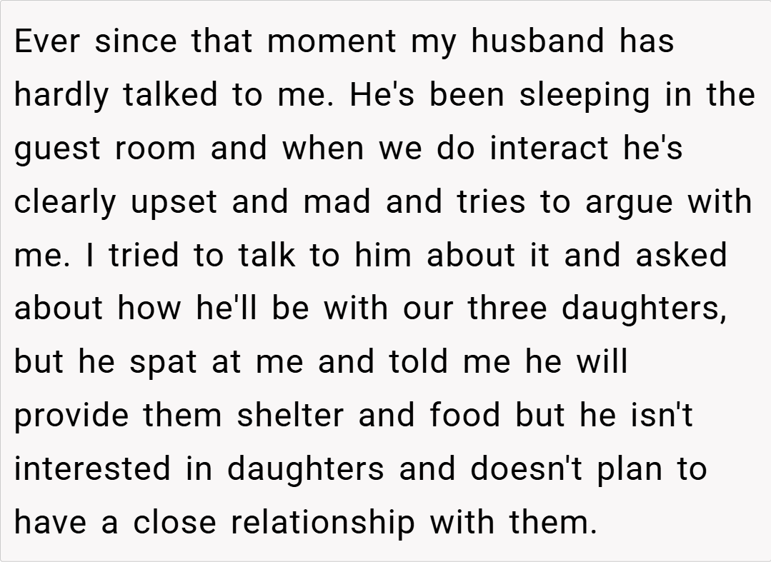 Delving further, it’s important to consider the lasting impact of such conditional love. The husband’s behavior not only alienates his wife but also sets a worrisome precedent for how future children might be valued. By expressing disdain for the prospect of having daughters, he inadvertently sows seeds of division that could affect the children’s self-worth and familial relationships.